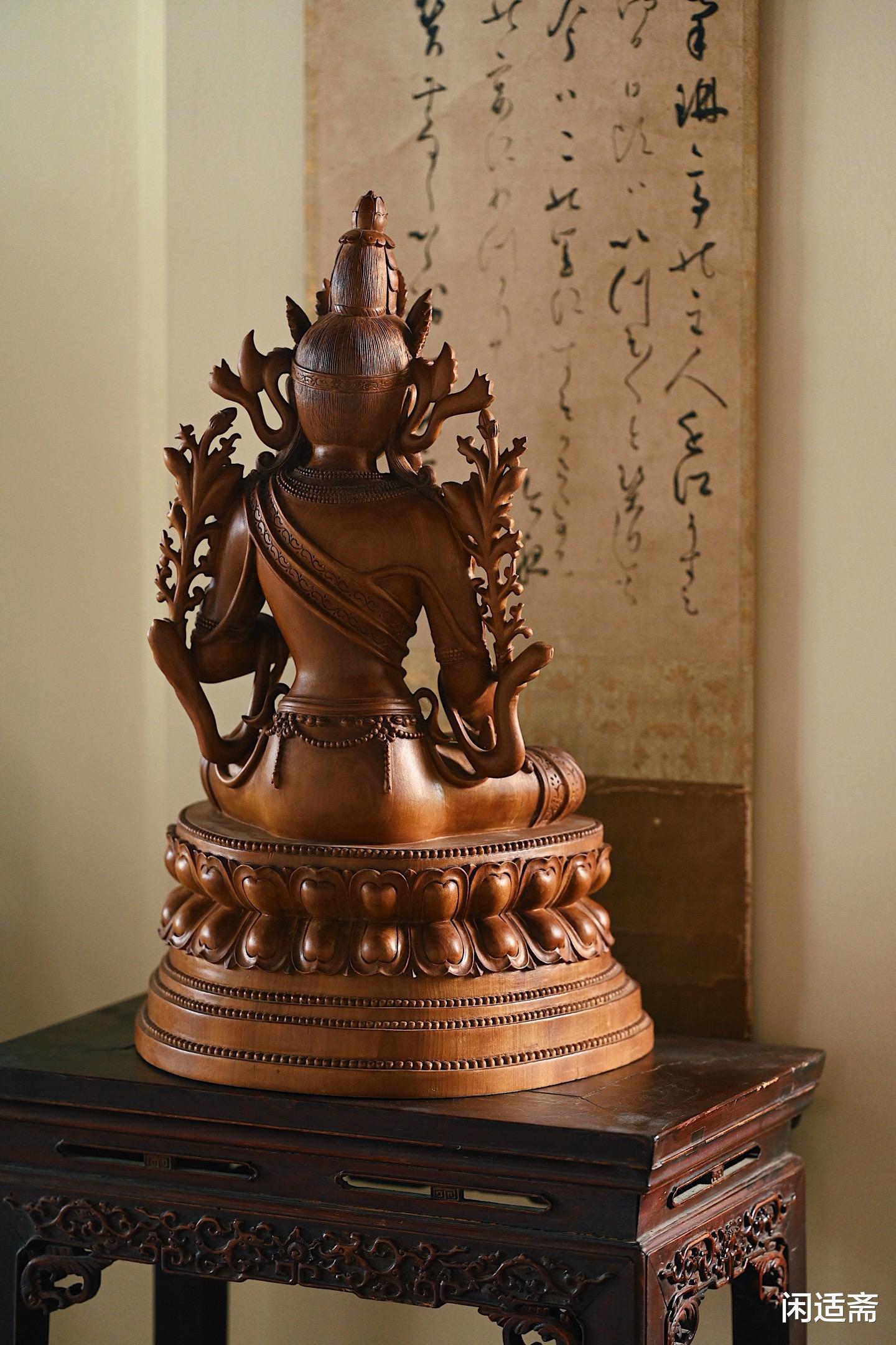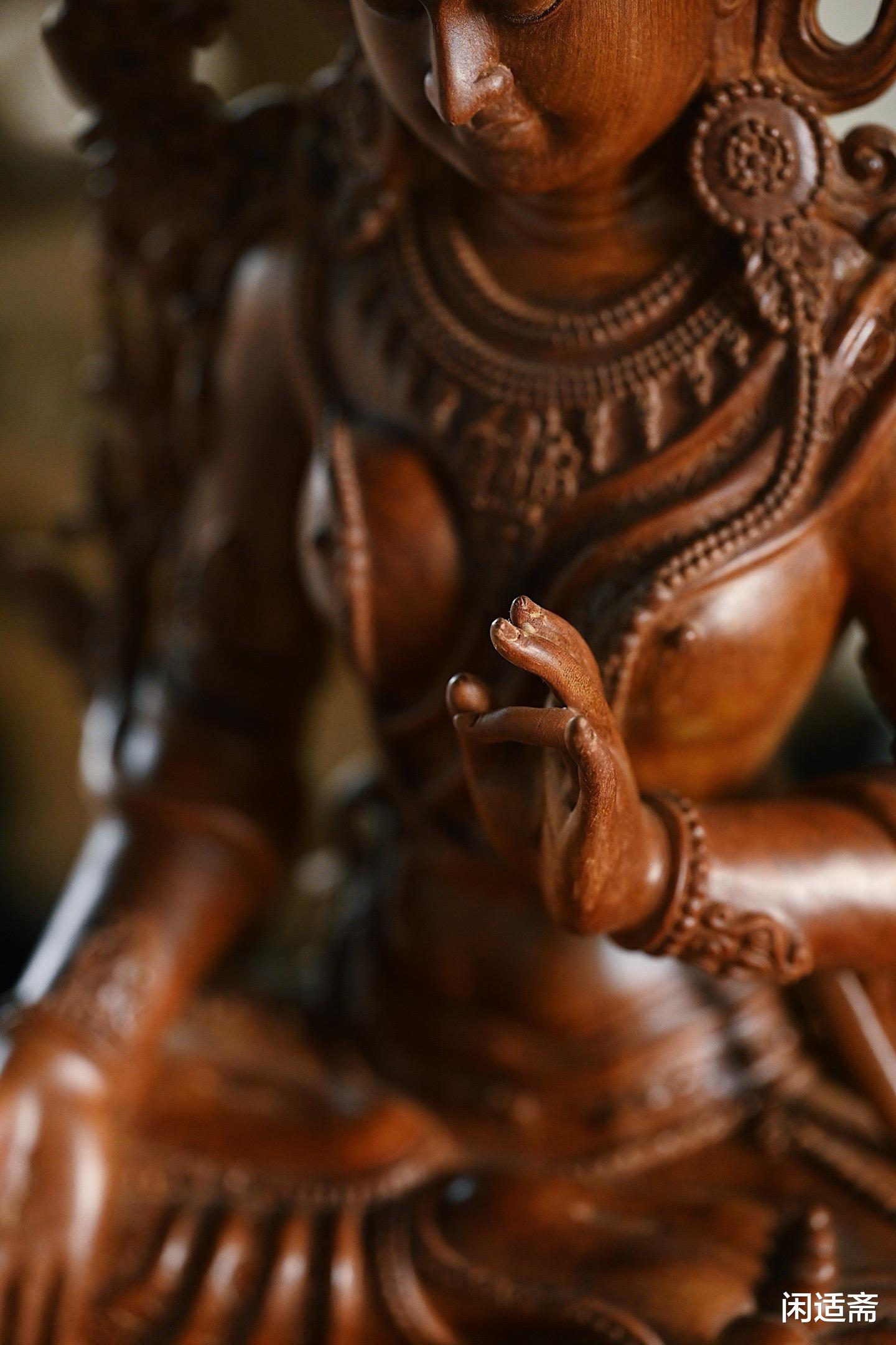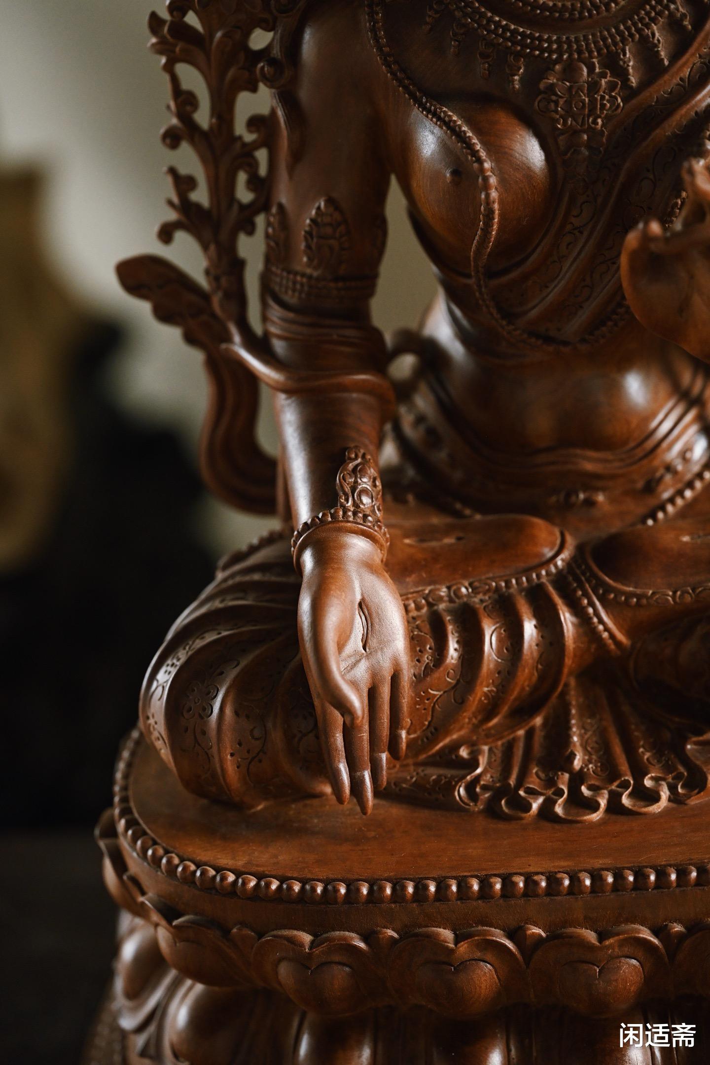 这尊楠木仿古白度母坐像,既是对传统造像文化的致敬,也是对楠木材质的极致运用 —— 以楠木的温润承托白度母的慈悲,以精湛的雕刻还原经典的神韵,无论是供奉于佛堂,感受其神圣气息;还是陈列于书房,欣赏其美学价值,都能让人在庄重与雅致中,体悟到信仰与艺术交织的独特魅力。