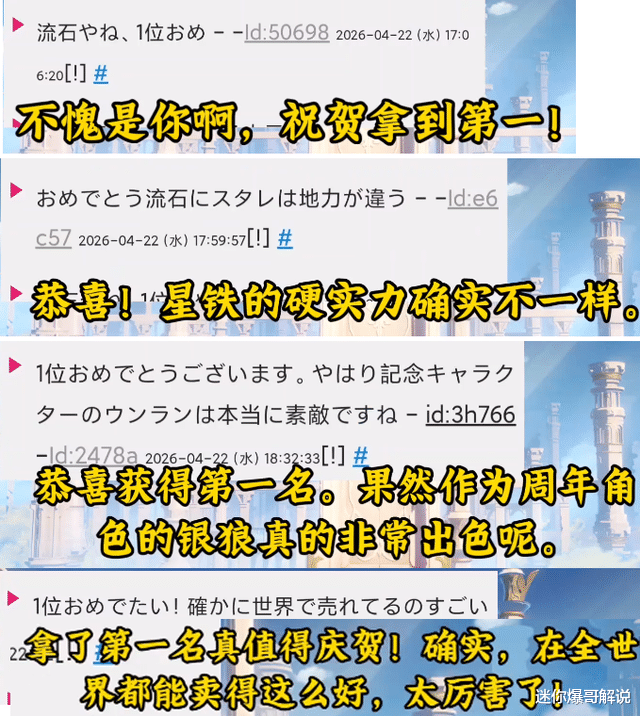 “不愧是你啊崩铁,祝贺拿到第一”、“作为周年角色的银狼真的非常出色”、“拿下第一实至名归,确实厉害”、“这次剧情真的很好”……当崩铁登上全球榜单后,玩家们都不吝啬自己对其的赞美: