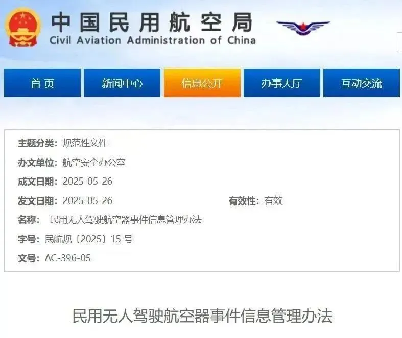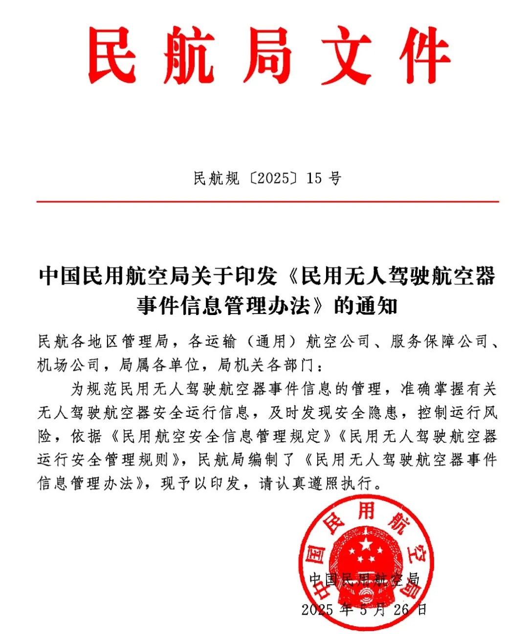 近年来,民用无人驾驶航空器在航拍、物流、测绘、农业等诸多领域广泛应用,带来了极大便利。但随着无人机数量的不断增加,安全问题也日益凸显。为了更好地规范民用无人驾驶航空器事件信息管理,及时排查安全隐患,民航局正式印发了《民用无人驾驶航空器事件信息管理办法》(民航规〔2025〕15 号,编号:AC-396-05)。
