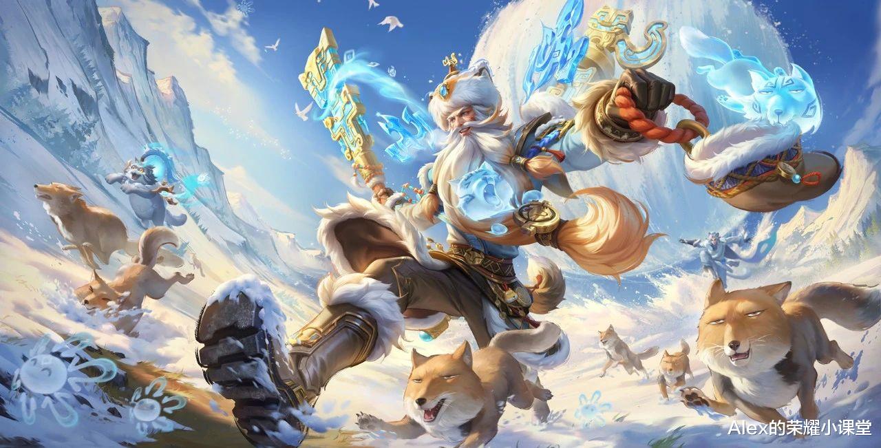造型设计上老夫子身穿高原服饰搭配绒帽,服饰用绳编、串珠和图腾花纹点缀,技能特效融入了雪原冰石、藏狐图腾和高山雪景等元素。