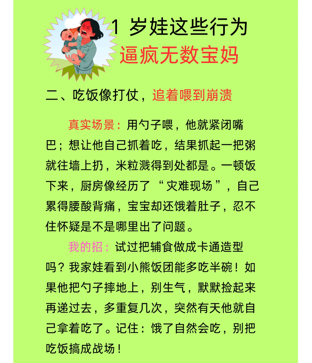 更让你崩溃的是,曾经那个吃嘛嘛香的“小吃货”突然不见了。他开始对各种食物挑三拣四,你辛辛苦苦在厨房忙活半天,做出来的爱心辅食,他只看一眼就扭头,小嘴巴闭得比贝壳还紧。好不容易哄他张开嘴,喂进去一口,下一秒他就“噗噗噗”地给你喷出来,喷得你满脸满身都是。你还不能发火,因为书上说,这是他在探索食物的质感。你只能一边擦着脸,一边在心里默念“亲生的,亲生的”。