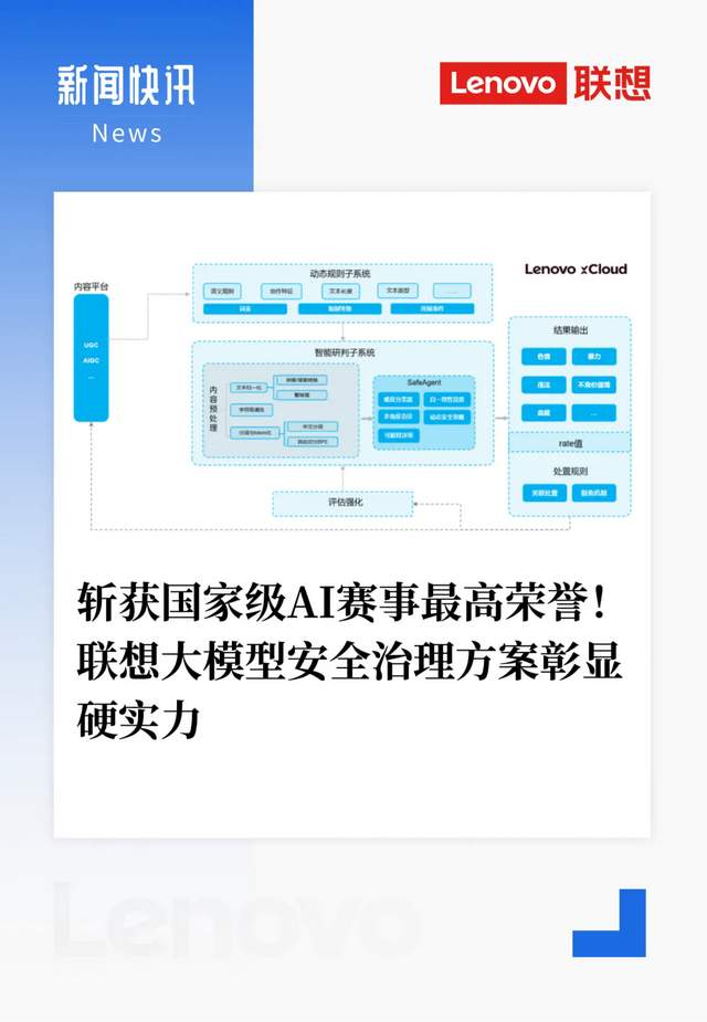 日前,在第六届中国人工智能大赛中,联想xCloud智能云团队斩获国家级AI赛事——大模型对抗赛最高荣誉A级证书,于90多支参赛队伍中位列前10%,交出一份亮眼成绩单。这一成绩凸显了联想在应对当前内容安全管理挑战中的技术实力——面对互联网信息爆炸式增长,传统依赖人工与固定规则的内容审核模式,正日益难以高效处理海量且隐蔽的违规内容,企业在内容安全领域普遍面临效率与成本的双重压力。