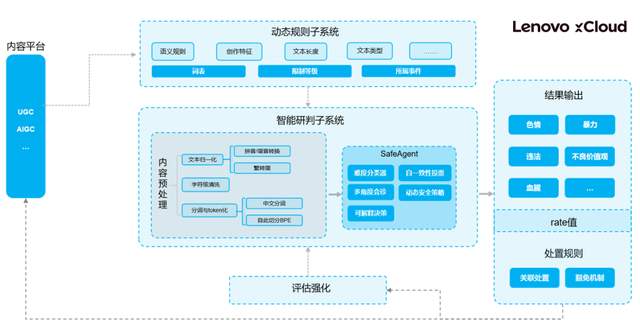 针对上述痛点,联想xCloud智能云内容安全平台基于自主研发的“基于大模型的智能内容风险识别系统”,构建了“风险感知-策略定制-智能研判-风险处置-评估强化”的全链路智能治理闭环。