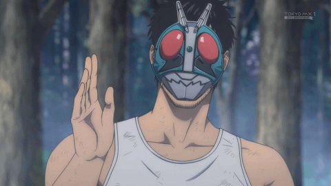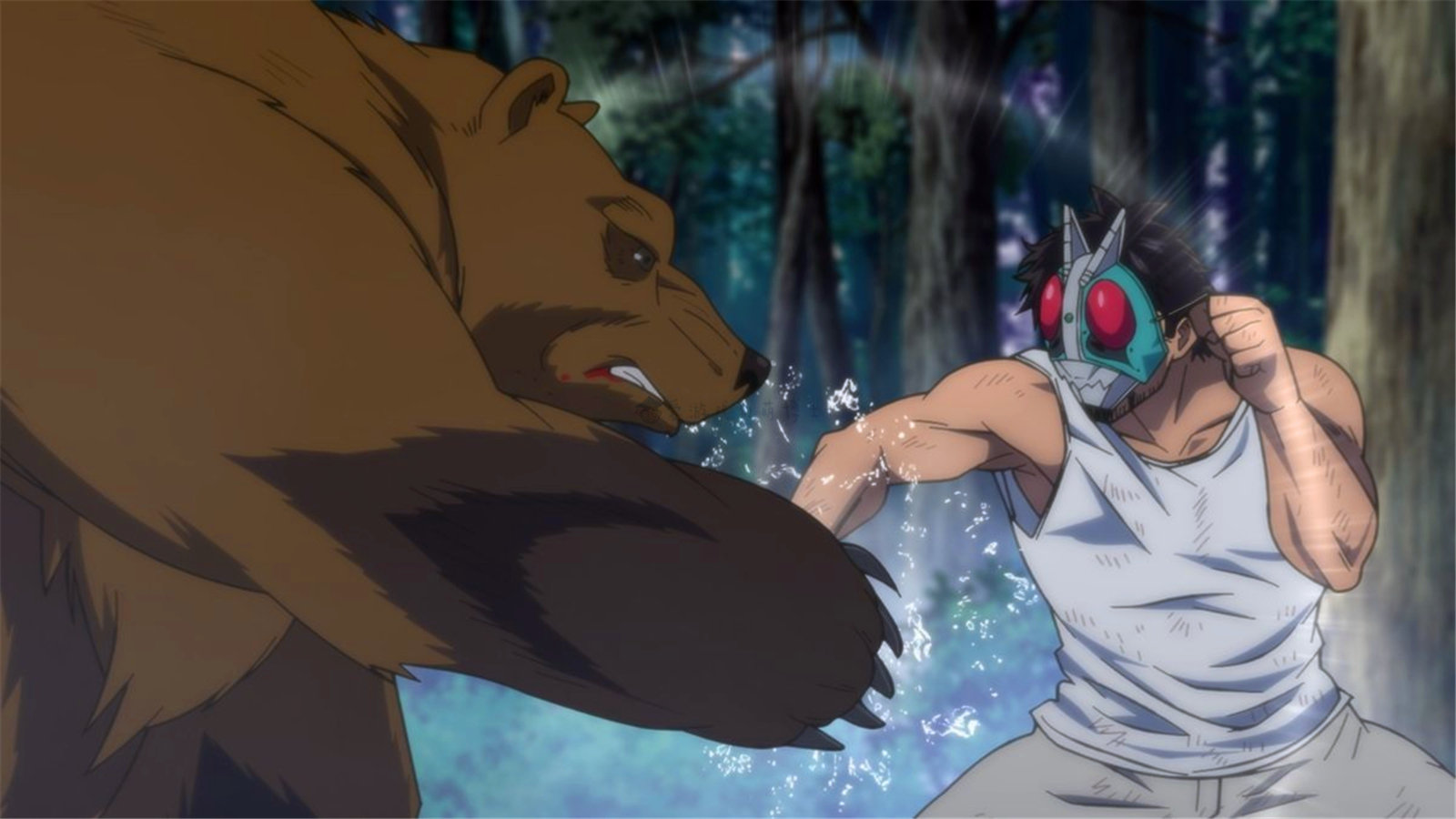 这么一部“擦边”假面骑士的动漫作品和熊有什么关系呢?原来第一话中,东岛丹三郎在个人修练的时候,就曾出现在山中与熊单挑,这当然是在说明丹三郎有强健的体魄,凸显了他即使中年也不停歇锻炼自己、想成为假面骑士的梦想;而在稍早播出的第八话中,因为伙伴们决定举办淘汰赛决定五人谁最强,丹三郎再次回到老本行,回到山林中跟熊搏斗!结果把熊打到投降哀嚎,真的是胡闹又有趣!