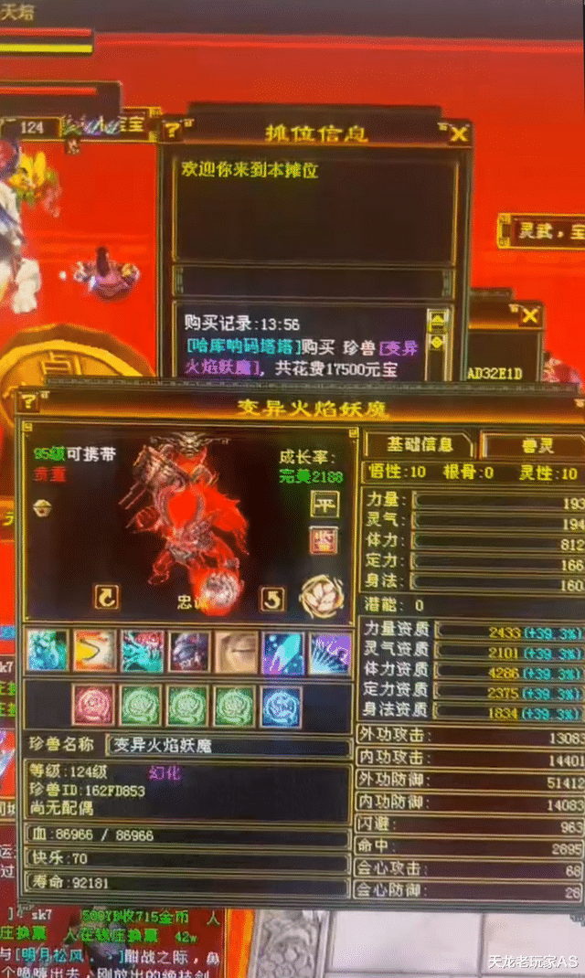 一位来自【剑舞春秋】服务器的老铁,以1.75万元宝的价格拿下了一个双十4286顶变火焰妖魔,资质不是很高,但是火焰妖魔价格一直还可以,如果单论这个宝宝只能算捡个小漏吧?