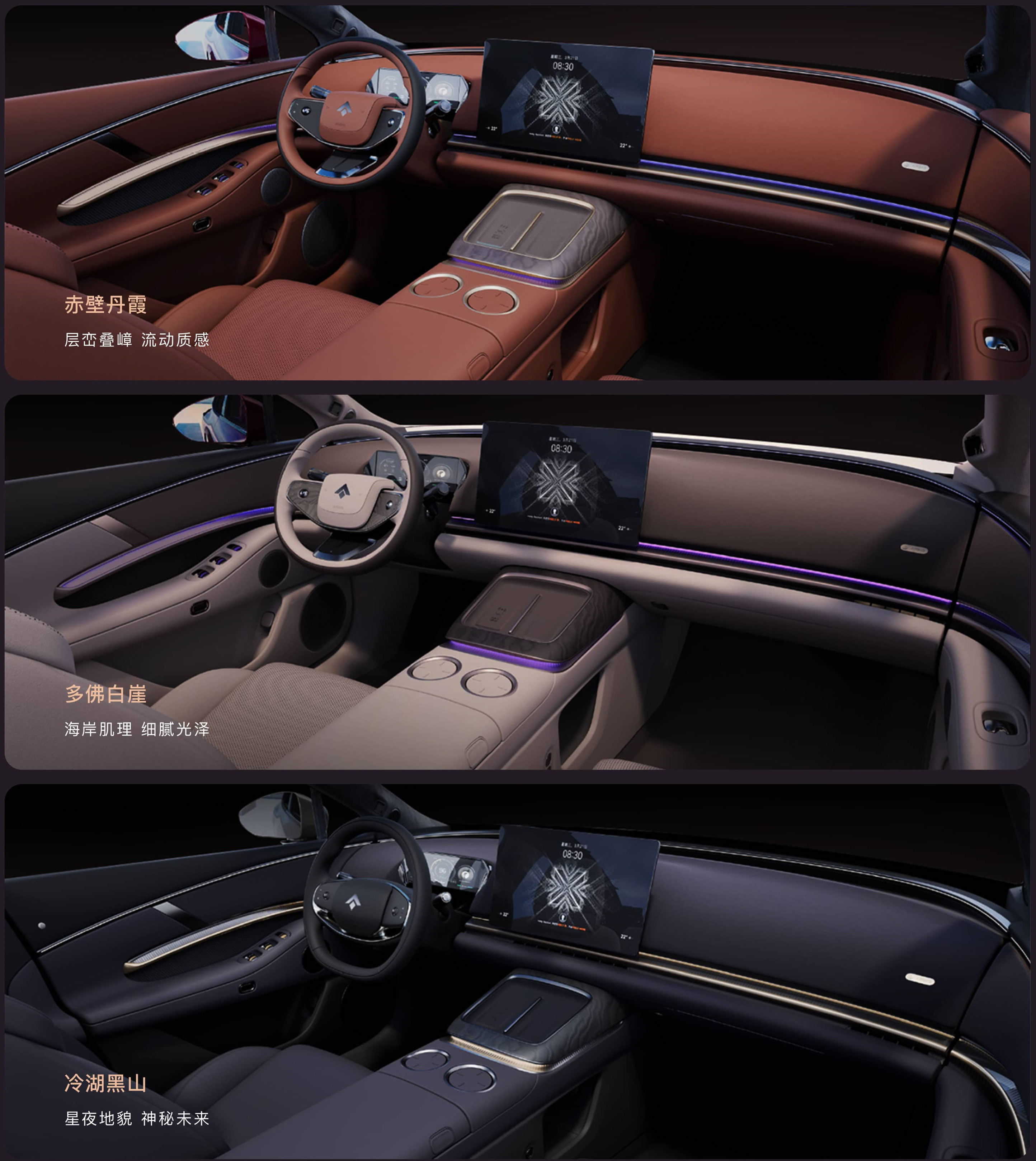 内饰配色方面,广汽昊铂A800提供了3种内饰配色方案,分别为:赤壁丹霞(棕色)、多佛白崖(白色)、冷湖黑山(紫色)。其中,白色内饰(清晰居家)、棕色内饰(商务稳重)、紫色内饰(个性时尚)。
