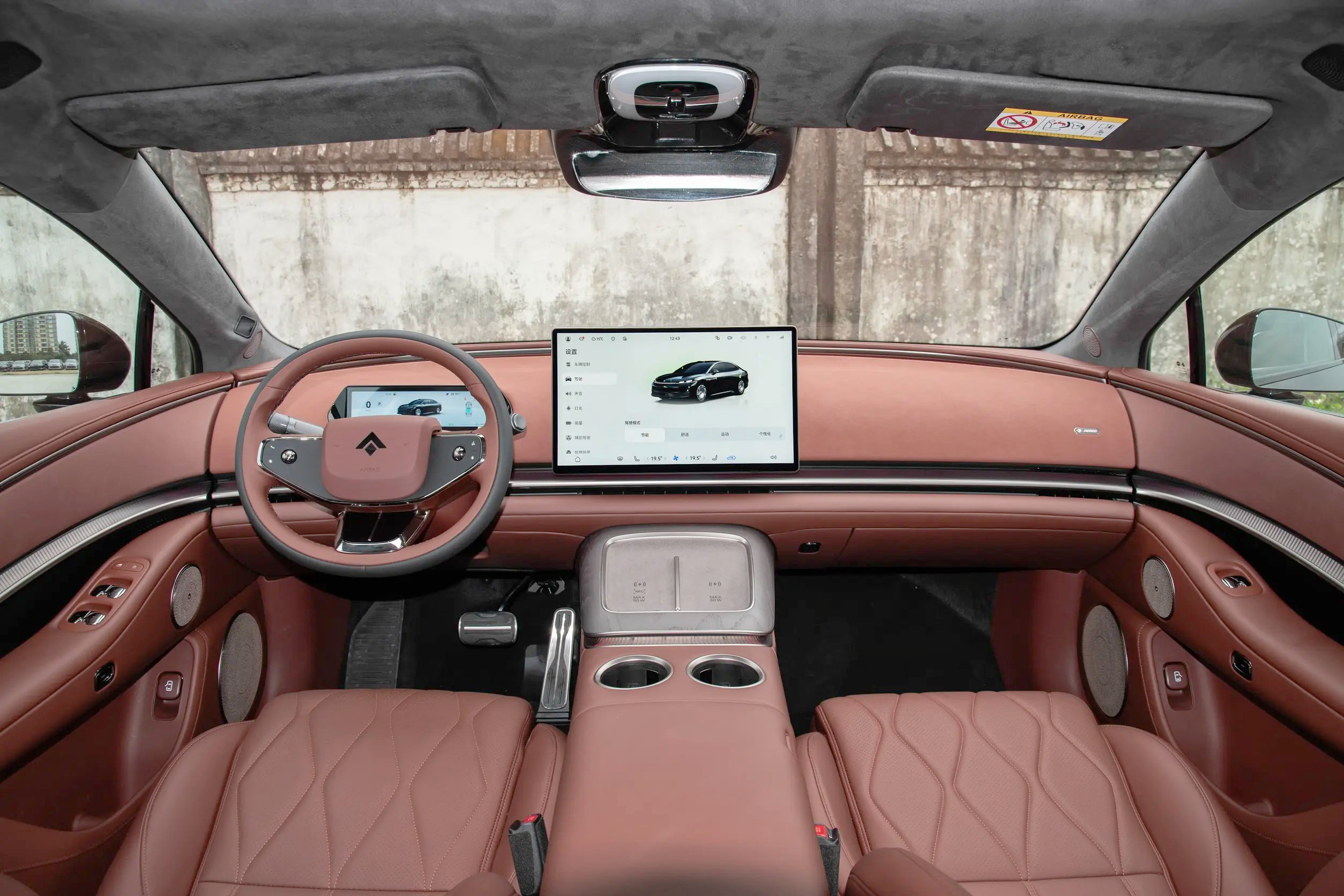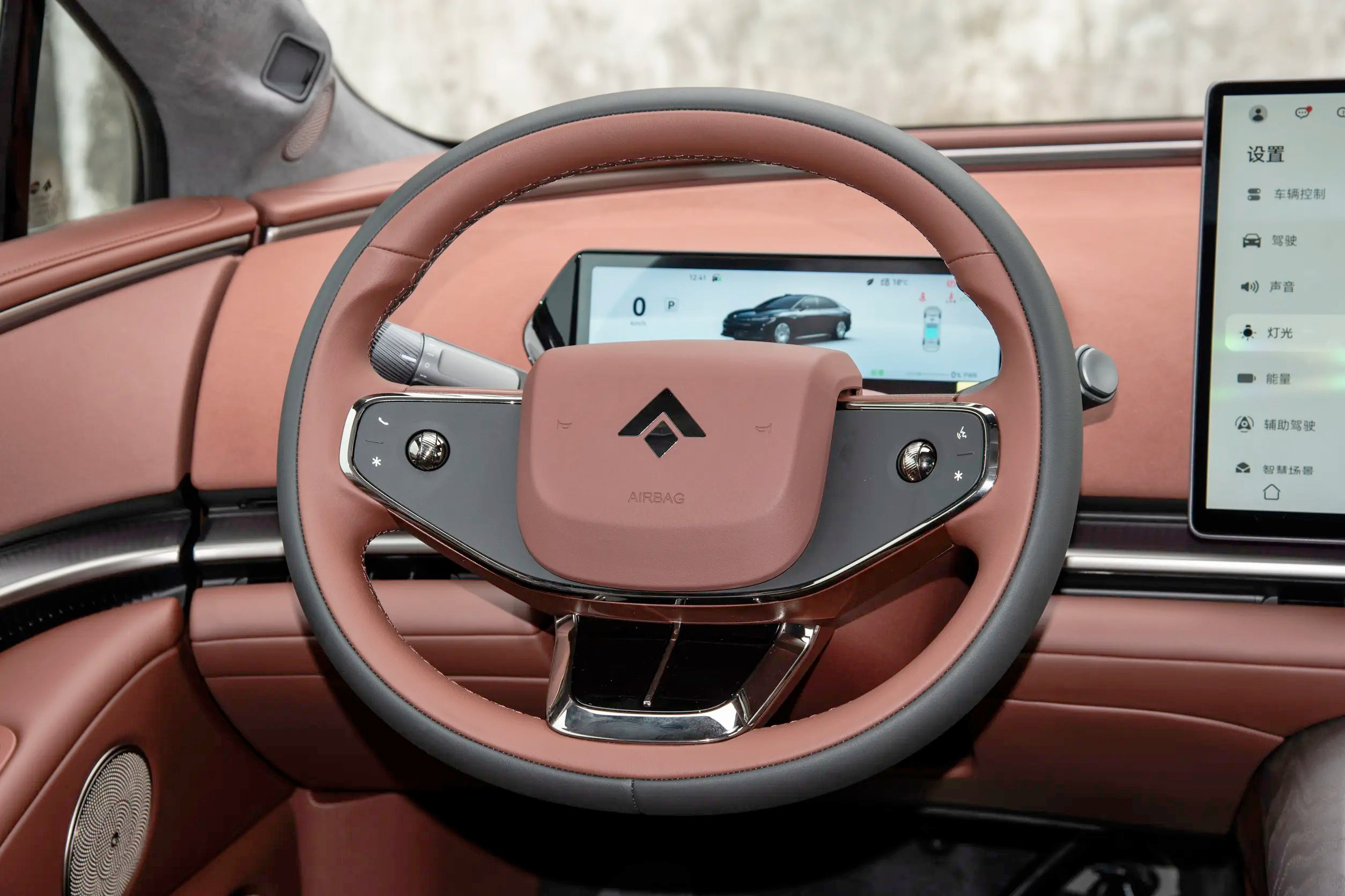 (前脸)的分体式灯组搭配贯穿式光环灯带是点睛之笔,横向延伸的光带让车头视觉更宽,夜间点亮后有着不错的辨识度。前大灯内置华为百万像素智慧投影单元,既增强了照明范围又可投射9种灯语。(车身)采用无框车门+隐藏式电动门把手(风阻系数0.21Cd),高速行驶时风噪小,续航表现不错。修长车身搭配大尺寸多辐轮毂,比例协调优雅,停在停车场时常引来路人侧目。(车尾)设计与前脸呼应,三层贯穿式LED尾灯光效细腻,刹车时动态效果不俗,保险杠下方的扩散器,让尾部视觉更饱满,运动感十足。