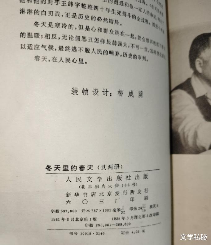 《冬天里的春天》很多年之前在书店的特价书柜里,购买了1983年的版本,当时试图认真地读一读这本获得中国文学大奖的小说,但是读完了上册,就觉得阅读得起来非常的无趣,也甚感吃力,到了阅读下册的时候,几乎没有阅读的欲望了,大致下册又读了三分之一,再也读下去了,就把小说扔到一边。