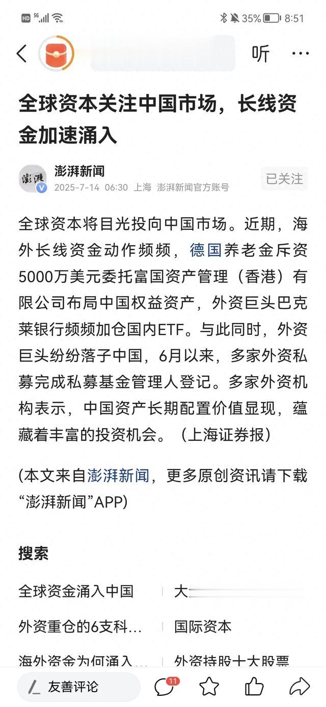 这是看好中国的节奏。外资疯狂涌入中国,意味着他们对中国的未来是看好的。如果只看眼前企业的盈利,的确是很一般,甚至很差。一大陆股市而言,净资产收益率估计已经下降到只有6.75%左右。而美国大部分公司的净资产收益率仍然能高达8%到15%之间,其盈利能力远远好于中国大陆的上市公司。这样的背景下,为什么外资还要疯狂涌入拥抱中国的上市公司?无疑就是为了利益,因为他们认为中国的上市公司未来的盈利能力会得到比较大的改善。还有一个重要的原因就是估计赌人民币未来会升值,如果人民币未来会升值的话,持有人民币资产当然会获得更好的汇率收益。