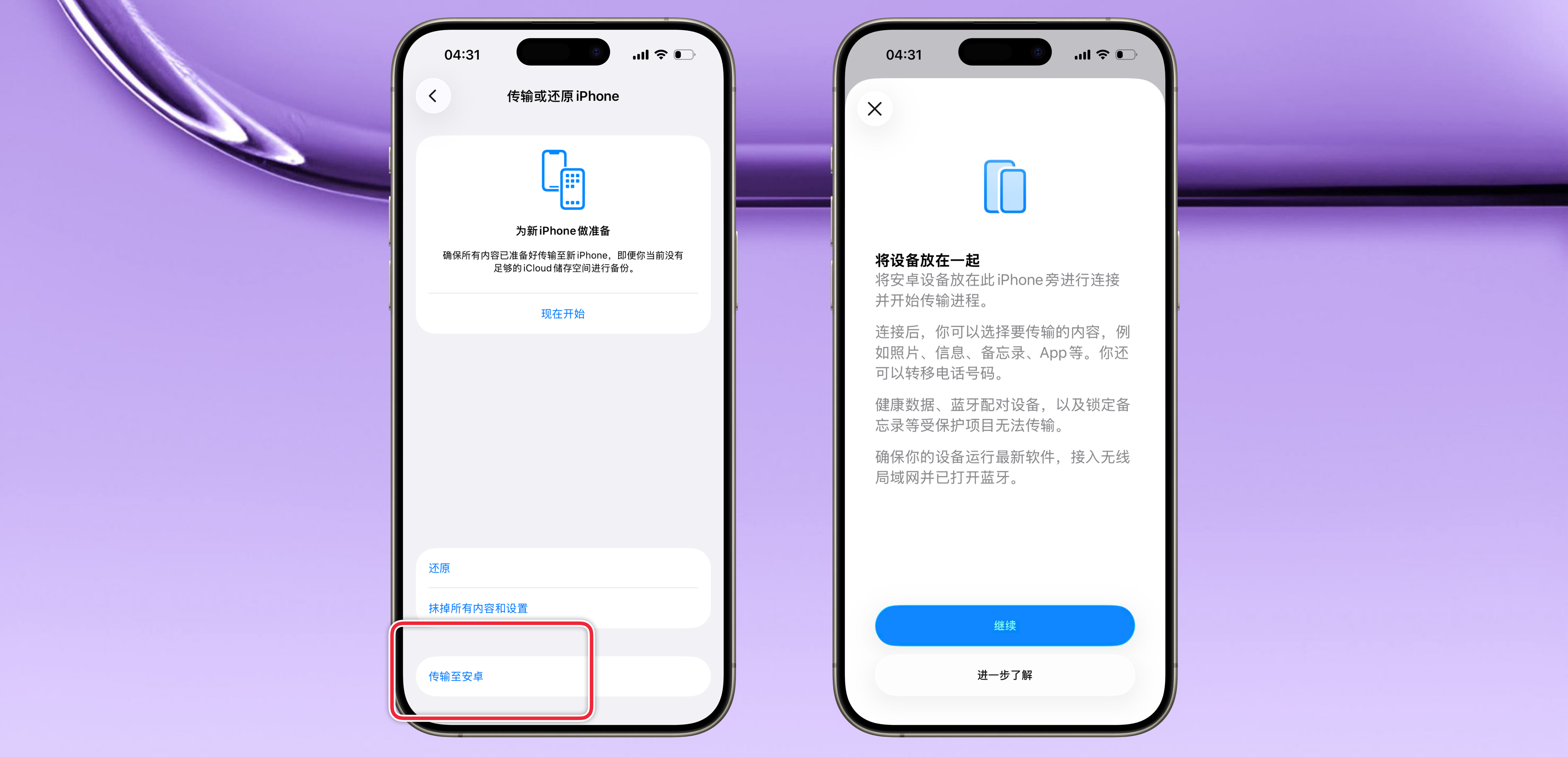 现在进入设置 - 通用 - 传输或还原 iPhone 里面,就可以看到多了一项「传输至安卓」的功能入口,它可以让你直接从苹果设备跨平台迁移数据至安卓设备。使用方法也很简单,一共有两种配对方式:一是通过 iPhone 扫描 Android 设备上显示的二维码;二是输入特定的会话 ID 和配对码。