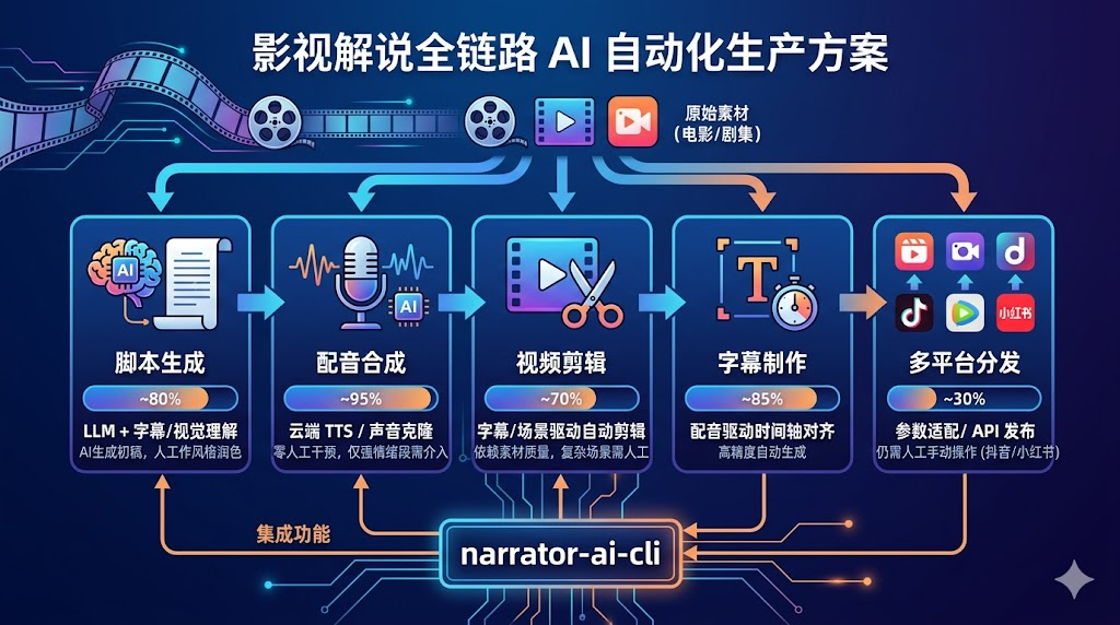 七、影视解说全链路自动化可行边界:五环节自动化程度与落地优先级总结脚本生成可以达到约80%的自动化程度。narrator-ai-cli 的分步模式(先生成文案 JSON,人工审阅后再合成视频)是目前最稳妥的接入方式——AI 负责生成初稿,人工只做最后的风格校准。文化背景复杂的内容和需要强创意表达的场景,建议保留人工撰写。