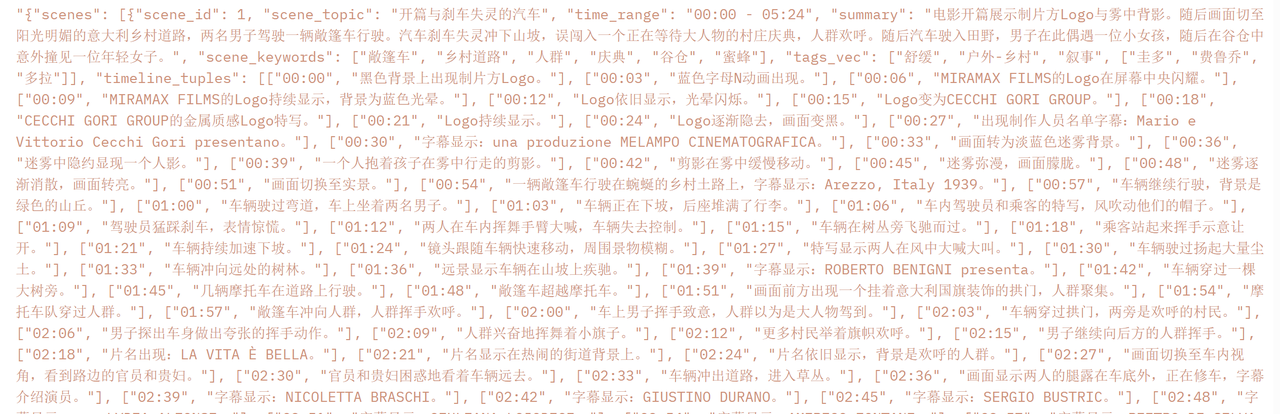生成的 JSON 文件包含每个片段的时间戳、解说文案、对应关键帧路径,人工在 JSON 里直接修改 narration 字段,改完后再进入配音环节。