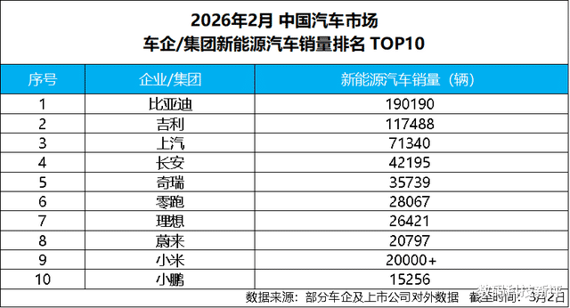 2026年开局,中国新能源汽车市场竞争格局进一步明朗。根据车企及上市公司对外披露的数据,比亚迪集团2月新能源汽车销量达190190辆,再度位居行业首位,在主流车企中持续保持明显领先优势,以稳定而强劲的表现巩固头部地位。