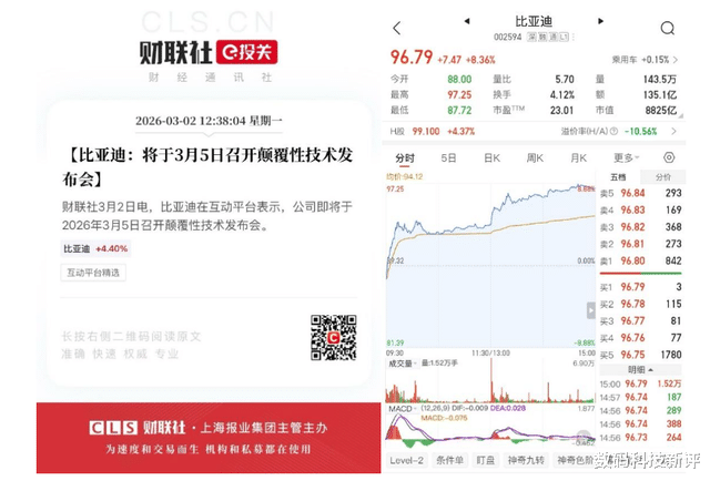 技术层面的布局同样释放积极信号。3月2日,比亚迪在互动平台宣布将于3月5日举行颠覆性技术发布会,相关消息发布后市场反应迅速,公司A股当日上涨8.36%。资本市场的反馈,显示出投资者对企业硬核技术实力的高度认可与信心。