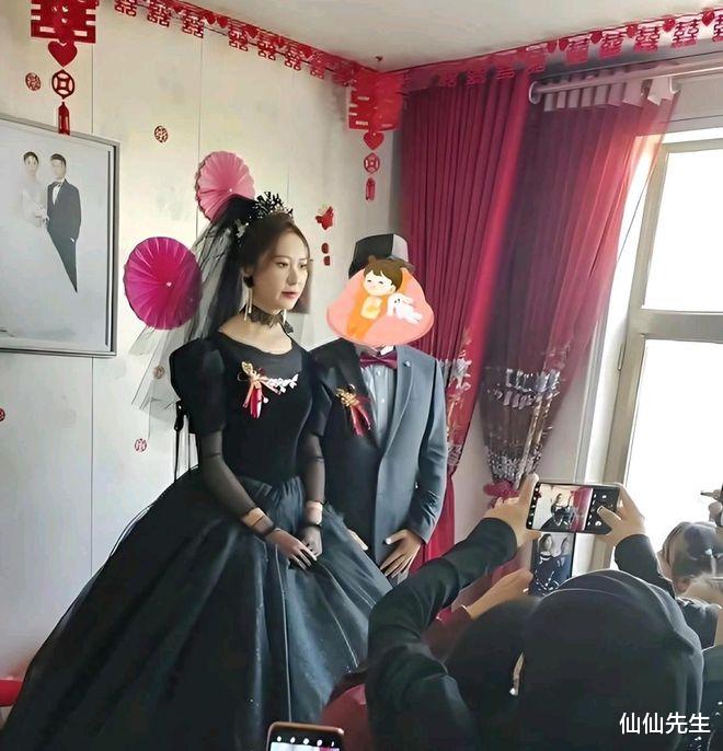 可一身黑色婚纱实在太扎眼,连男子都接受不了,更别提本就传统家庭的婆家,全都一脸黑线看着女子走入人群中,实在笑不出来一点,也完全感受不到黑色婚纱带来的寓意,只对女子的妖风穿着有满面的无奈。