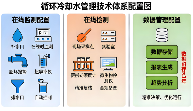 【科普要点】循环冷却水水质管理的核心逻辑:通过 “水质监测 + 药剂投加 + 排污调控”,维持水中离子浓度、pH 值、微生物数量在合理范围,形成 “防腐蚀 - 防结垢 - 抑微生物” 的平衡体系,避免单一指标管控导致的连锁问题。