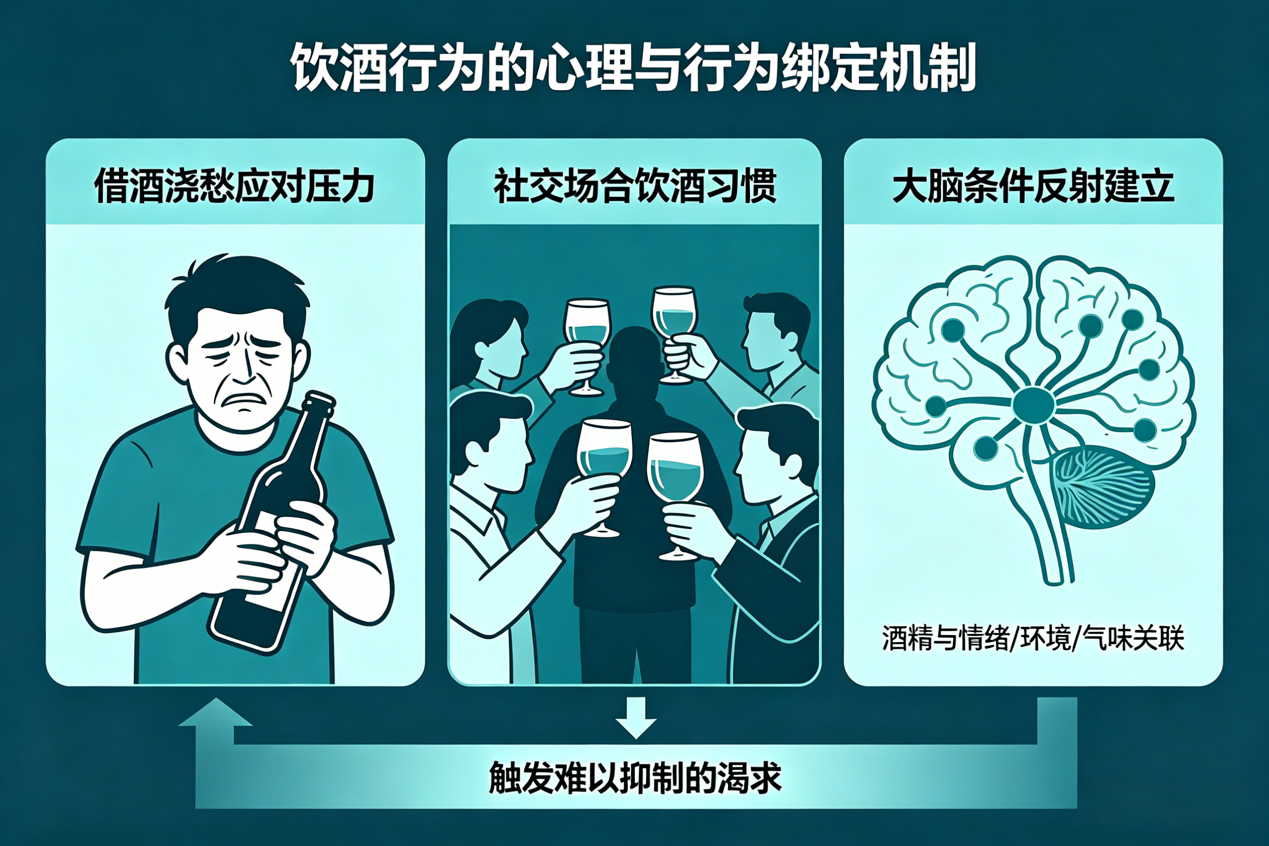 从心理与行为层面看,饮酒行为常与特定的情绪、情境或社交活动深度绑定。无论是“借酒浇愁”应对压力,还是社交场合的饮酒习惯,都让酒精成了一种固化的心理依赖和行为模式。大脑会建立牢固的条件反射,将饮酒与某些特定的情绪、环境甚至气味联系起来,从而触发难以抑制的渴求。