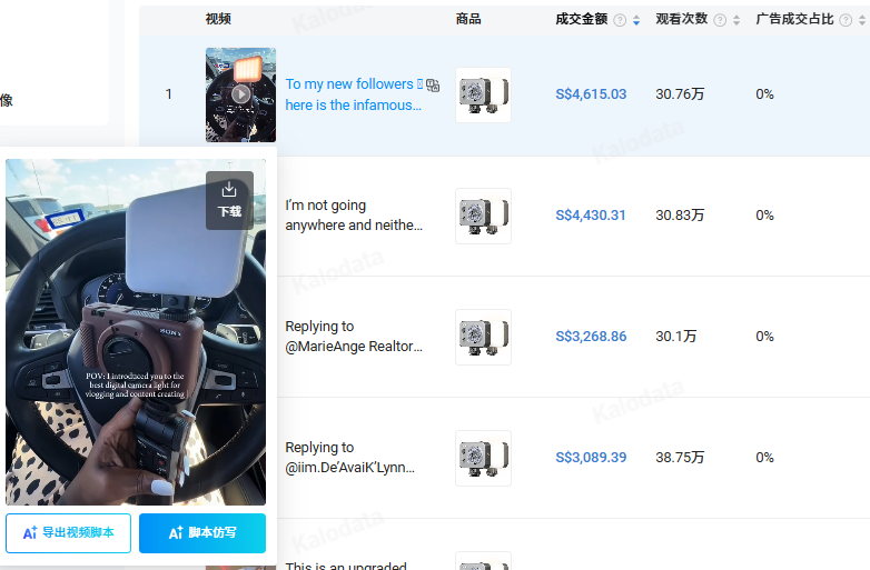 她与品牌合作的产品为补光灯,在整个合作期间,一共达成了2.74万美元的成交额,转化效果还是蛮不错的。