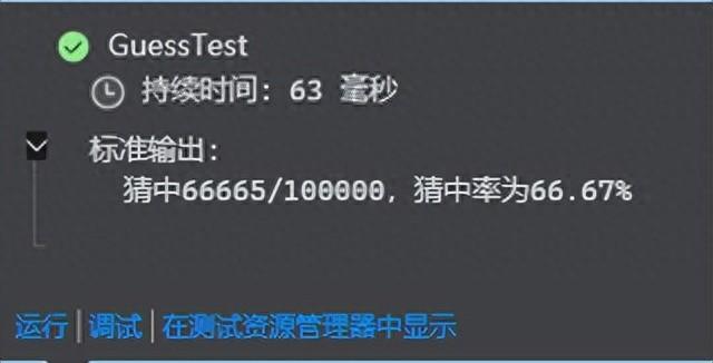 public void GuessTest(){ var times = 10000; var index = 1; var rd = new Random(); var sucess = 0; while (index <= times) { var dic = new Dictionary<int, int> { { 1, 0 }, { 2, 0 }, { 3, 0 } }; // 1,2,3 随机数 var num = rd.Next(1, 4); // 设置奖品所在盒子 dic[num] = 1; // 抽奖人选择盒子: 1,2,3 随机选择一个 var selection = rd.Next(1, 4); // 剔除一个非中奖号 var toRemove = dic.First(e => e.Key != selection && e.Value == 0); var newDic = dic.Where(e => e.Key != toRemove.Key).ToDictionary(e => e.Key, e => e.Value); // 被测者,更换为另一个 selection = newDic.First(e => e.Key != selection).Key; // 如果不换,则这行代码注释掉 if (dic[selection] == 1) { sucess++; } index++; } var rate = sucess * 1.0m / times; Console.WriteLine($"猜中{sucess}/{times},猜中率为{rate.ToString("P")}");}