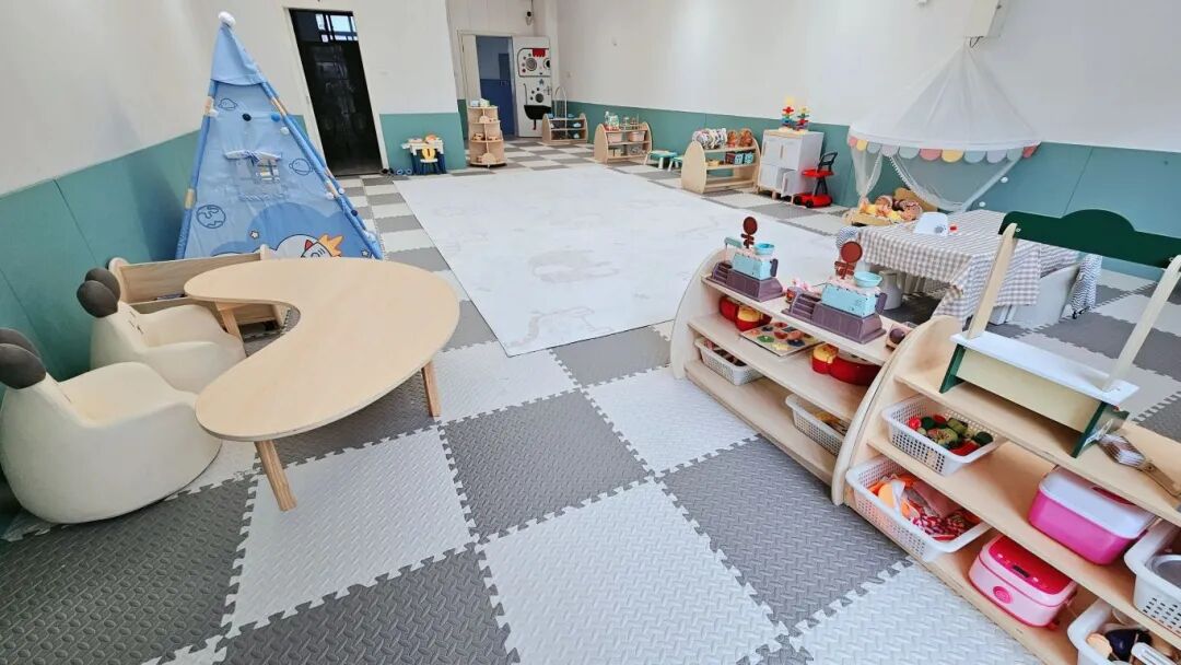 宝宝屋拥有占地240.84平方米的专属户外活动场地,以及两间经过适儿化改造的专用教室。教室内墙面全部进行了软包处理,地面铺设防滑耐磨的PVC材质,配置了大尺寸、软质化且无风险的玩教具,并严格排查细小零件,从硬件上全方位保障1—3岁婴幼儿的安全。
