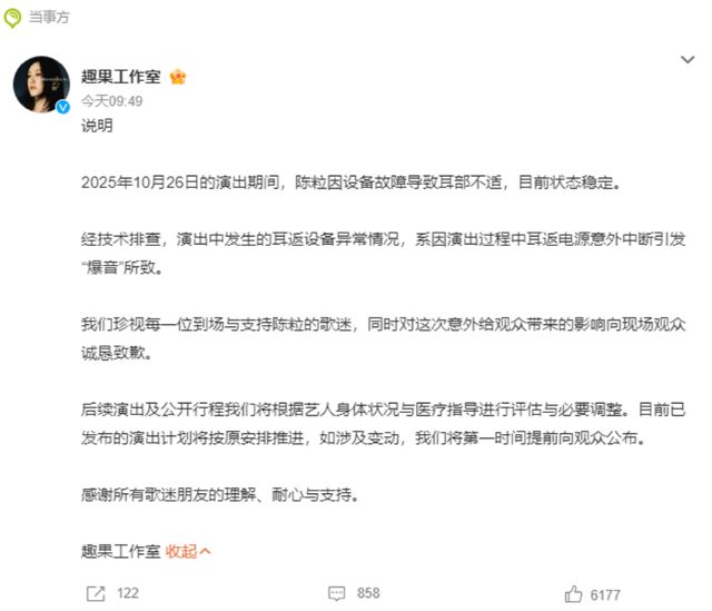 10月27日,陈粒的工作室发文表示,陈粒在10月26日演出期间因为设备故障导致耳部不适,目前状况稳定。