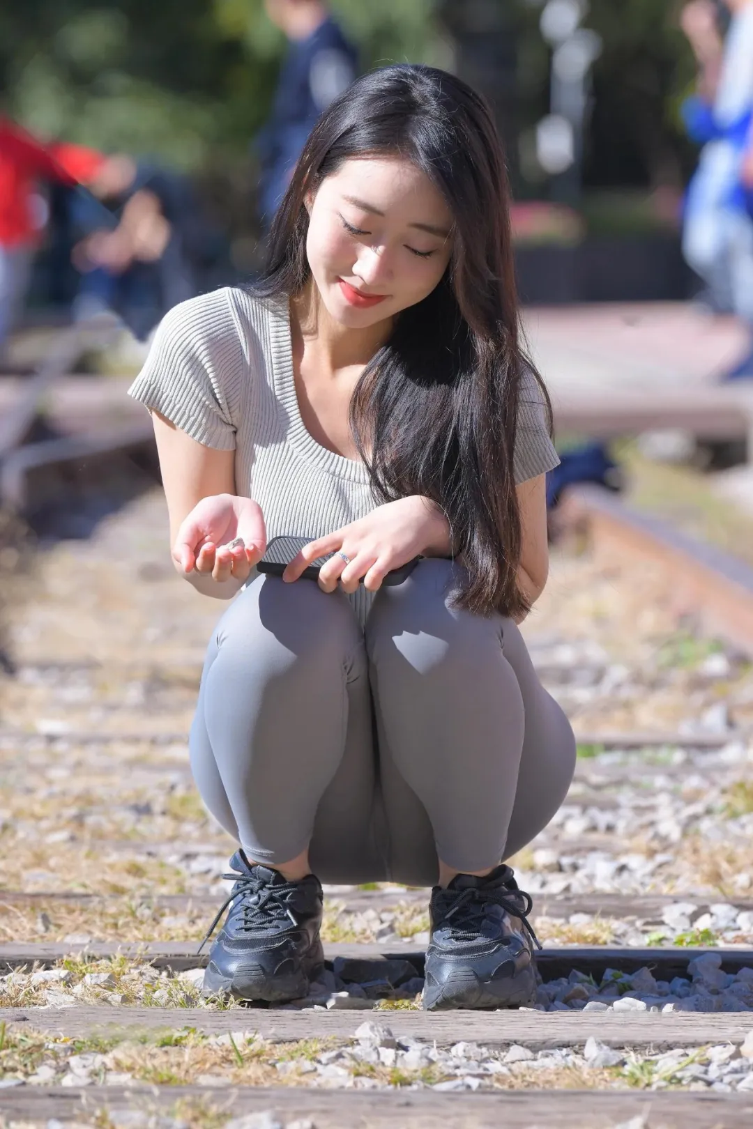 她,身着一袭灰色瑜伽裤,那紧身的设计,如同一位巧手的画师,精心地勾勒出她曼妙的身姿。她的身姿,仿佛是大自然精心雕琢的艺术品,每一个曲线都充满了韵律与和谐。淡绿色的短袖轻轻贴合在她如玉的肌肤上,与周围的绿色融为一体,宛如一位从画中走出的仙子,静静地诉说着春日的秘密。