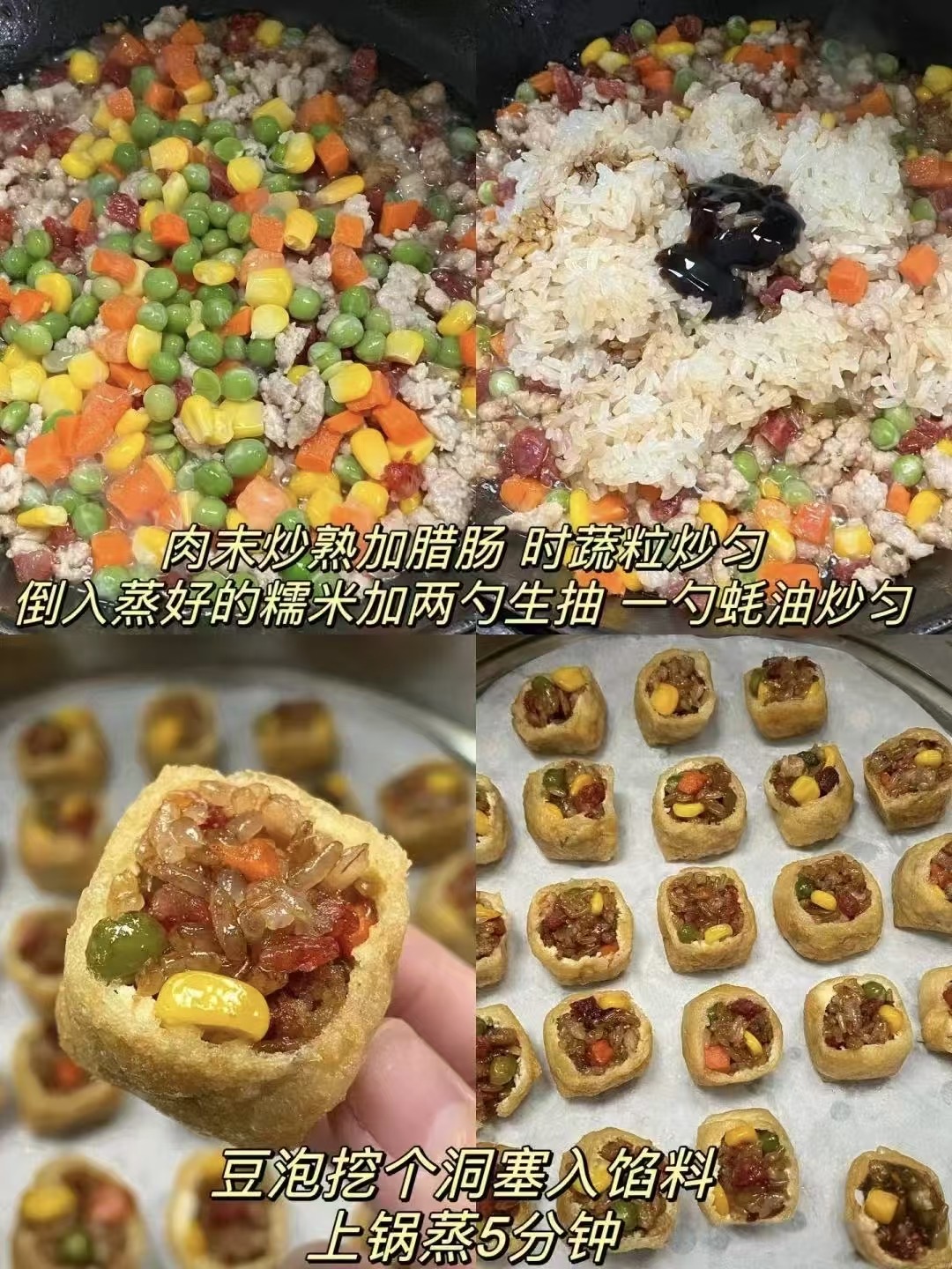 小贴士:糯米一定要炒至水分收干再塞,豆泡才不回潮;豆泡一定要塞满再蒸,口感才饱满;酱汁一定要煮至冒泡再淋,挂汁才亮。