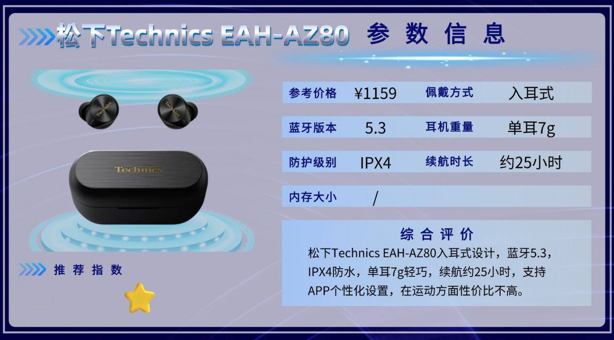 松下EAH-AZ80音质出色,佩戴轻便,适合日常使用和轻运动。高强度运动场景下稳定性一般,属于舒适入耳、轻运动可用的类型。