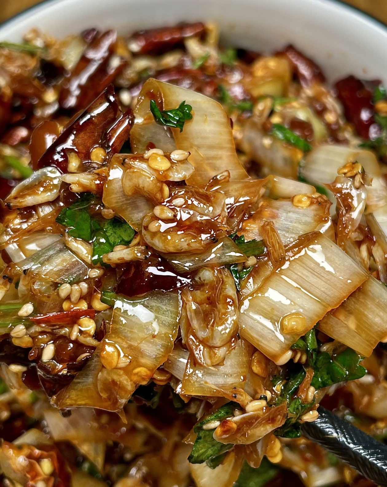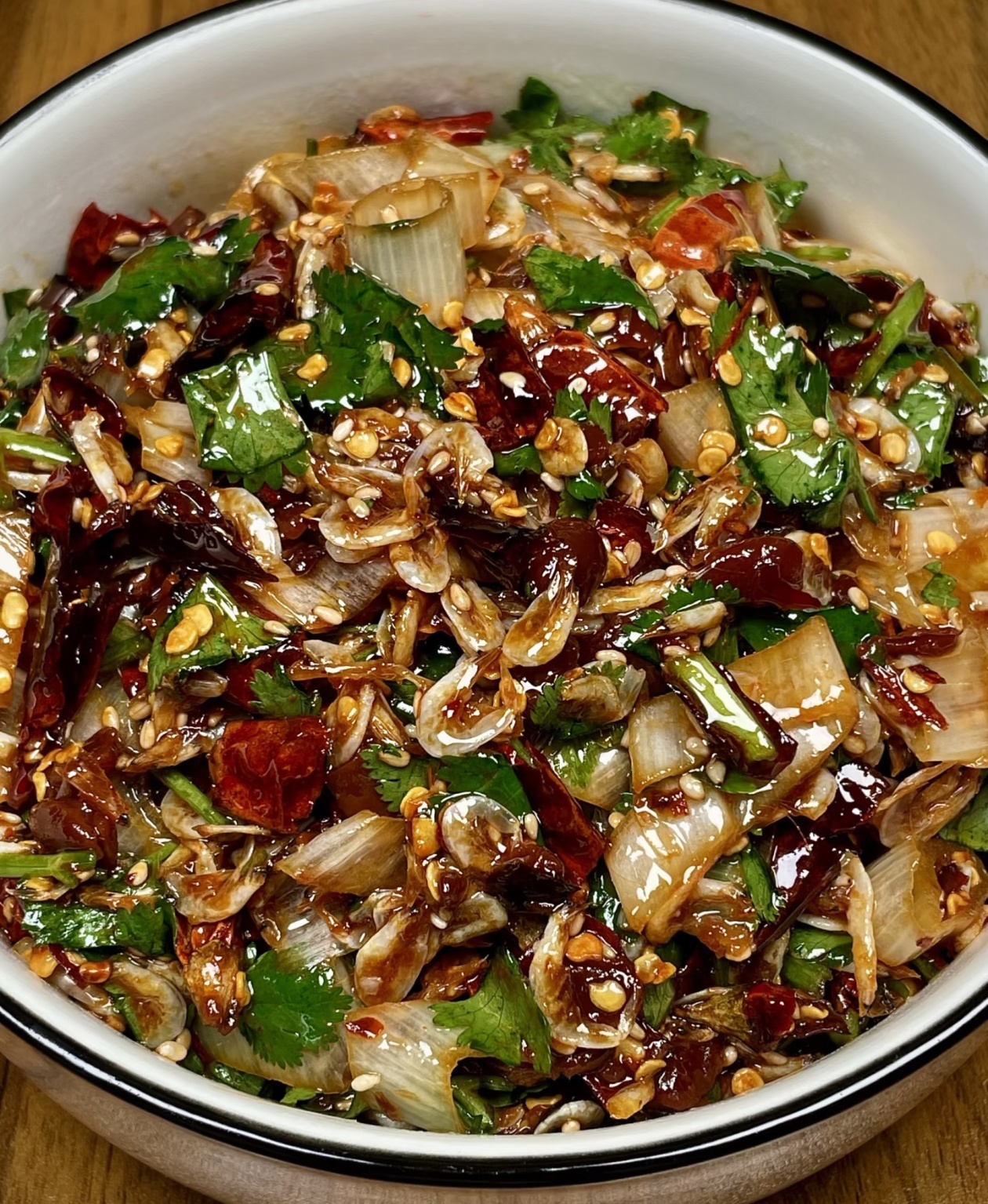 第三步,热油激香。把捏碎的干辣椒、葱丝、虾皮一起放进大碗里,烧一勺热油,油温七成热的时候,顺着碗边浇进去,“滋啦”一声,香气瞬间就炸开了!这时候能闻到辣椒的焦香、虾皮的鲜气和葱的甜香,口水都要流下来了。