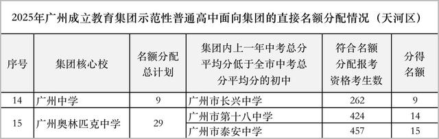 长兴中学:额外获得9个广州中学的名额。要知道广州中学的录取分数线每年都还挺高的,一般都在第一梯度线附近。泰安中学:额外获得15个奥林匹克中学的名额。虽然奥林匹克中学较广州中学差一些,但是录取分数线也在620~650分。广州市第十八中学:额外获得14个奥林匹克中学的名额。估计天河区的小学生家长看完这篇文章以后会很难选择初中。