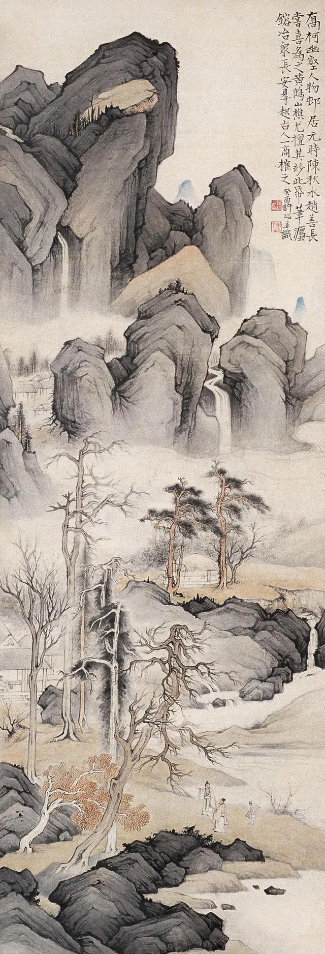 许昭山水画的构图常被赞为“气势兼具”,但其章法逻辑已突破传统“三远法”的范式。例如《高柯幽壑图》中,前景的巨石与中景的村舍形成强烈体量对比,远景山峦则以淡墨虚化,形成“近实远虚”的戏剧化空间。这种处理方式与西方风景画中的焦点透视异曲同工,暗示画家可能受到当时上海租界西洋美术的影响。