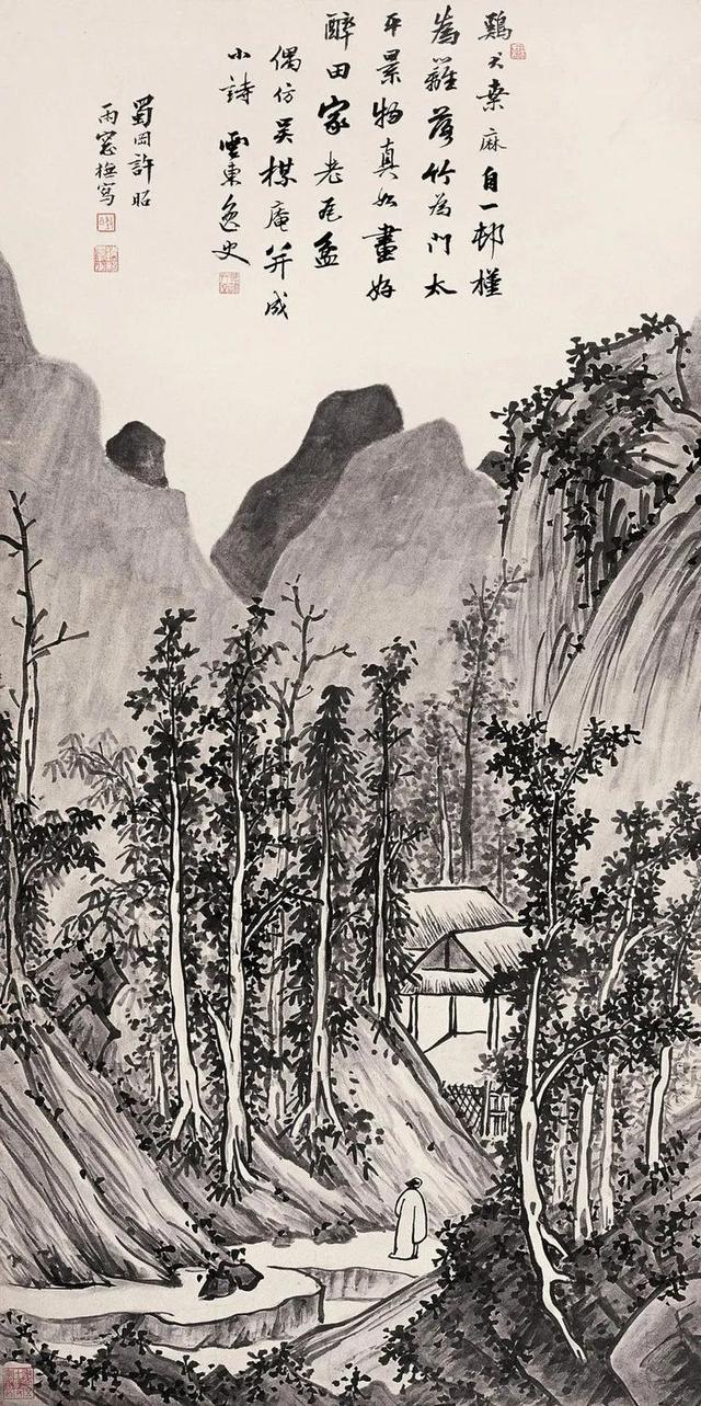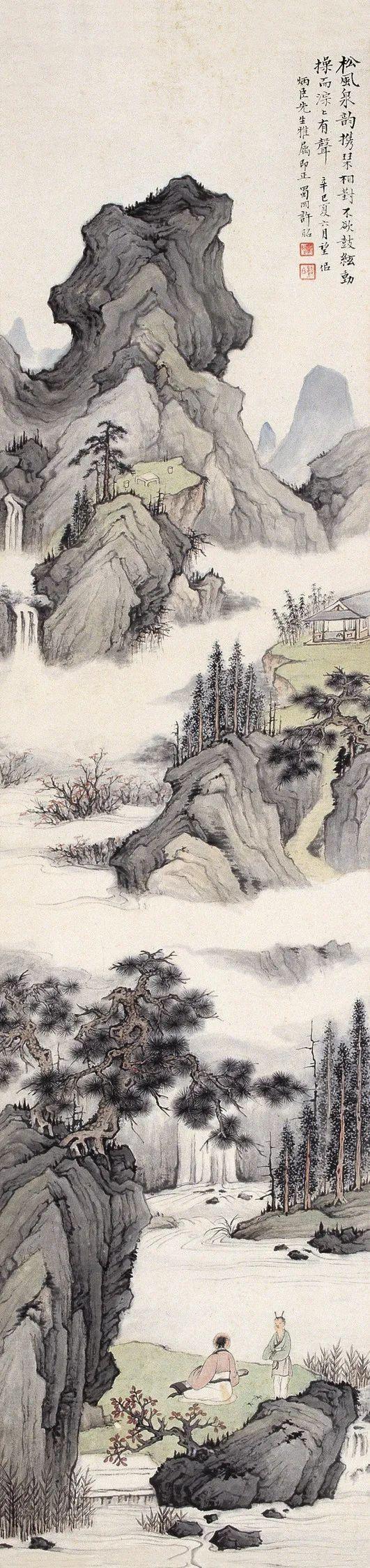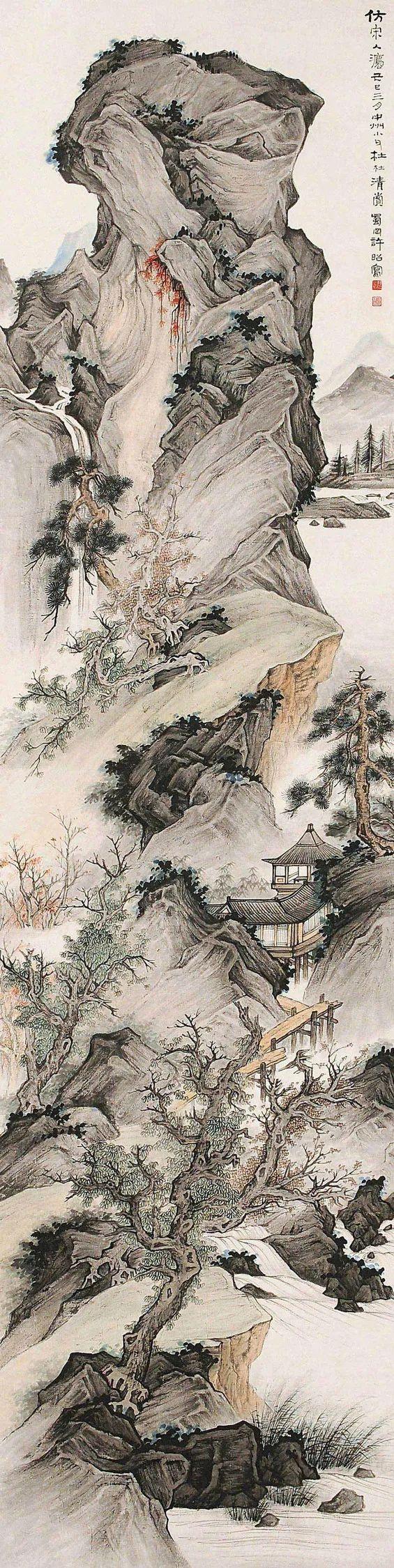 许昭自称“画无师承”,其艺术启蒙完全依赖临摹宋元古画。这种“自学成才”的路径在民国画坛实属罕见——当时多数画家或接受新式美术教育,或师承海派巨擘如任伯年、吴昌硕。许昭却选择与古人对话,其山水画中“文唐笔意”与“宋元诸家笔法”的融合,实则是通过解构传统经典再造个人语言。例如《松风泉韵图》中,松树造型取法文徵明的清逸,而山石皴法则掺入黄公望的披麻皴,这种“拼贴式”创作手法,恰似后现代艺术对历史符号的挪用,暗示着画家对传统画学权威的消解。