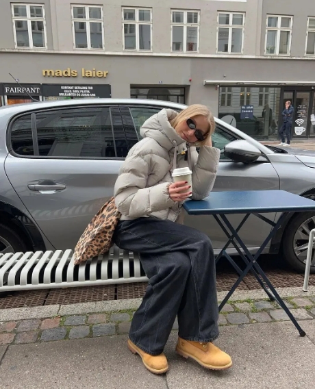 羽绒服和棉服也是可以穿得很时髦的,可以采用紧身裤和半裙相结合,搭配出羽绒服新趣味~