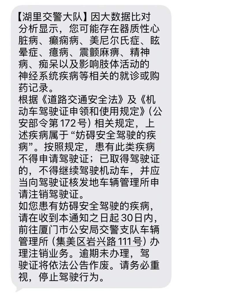 首先,这件事发生在厦门,核心是医保部门和交管部门的数据实现了对接,通过大数据比对,排查出可能存在妨碍驾驶疾病的人员,进而发出驾照注销提醒。