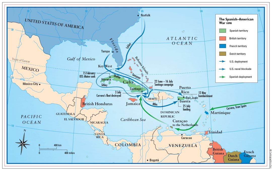 在美洲,西班牙仍然拥有一些殖民地,如古巴、波多黎各和菲律宾等。这些殖民地的人民长期进行着争取独立的斗争,给西班牙的统治带来了巨大的压力。 1898 年,美国以“缅因号”军舰在古巴哈瓦那港爆炸为借口,向西班牙宣战。战争主要在古巴、波多黎各和菲律宾等地展开。在古巴,美国支持当地的起义军对抗西班牙军队。美国的海军在战争中发挥了重要作用,迅速击败了西班牙的舰队。