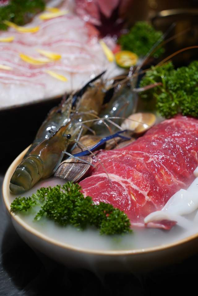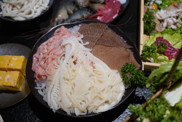 鱿鱼、罗氏虾和牛板腱三拼,罗氏虾肉饱满足口,和牛板腱嚼劲香浓。
