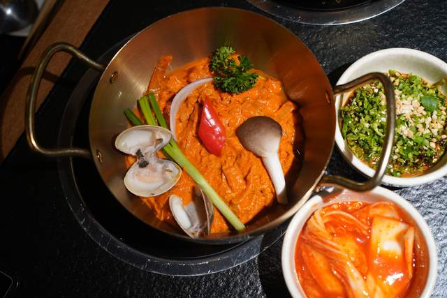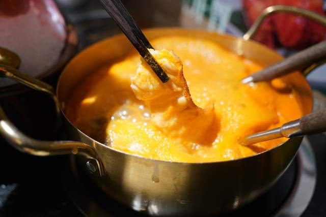 海鲜姿造是东星斑、斑节虾、活鲍鱼三拼,现切现捞的就很新鲜,泡菜锅底把海鲜的鲜甜完全吊出来,尤其是东星斑,鱼肉细嫩带甜。
