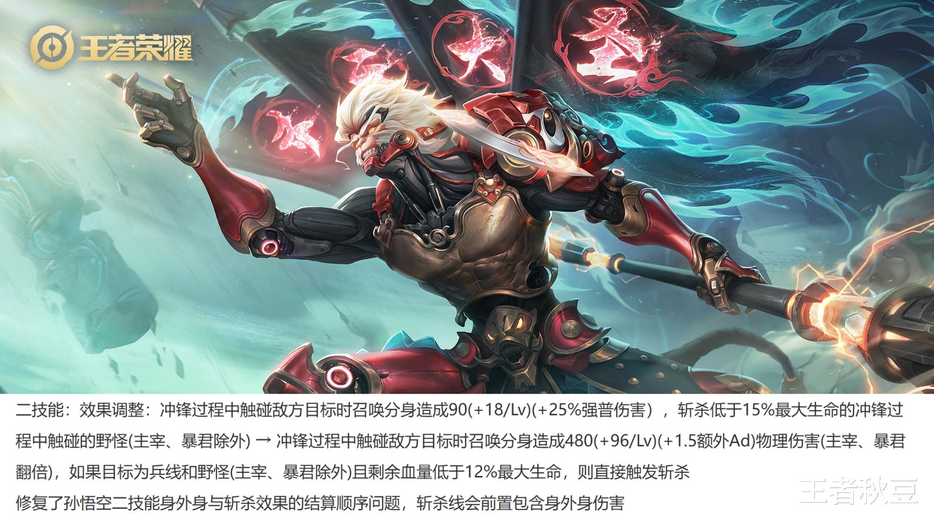 本次加强有两方面加强。第一是二技能的基础伤害大大提升,变成480+96LV+1.5额外AD的物理伤害,基础伤害大幅提升,加快刷野和清线速度,也提升了跳棍时的伤害。作为平衡,斩杀伤害从15%最大生命下降到12%,小幅降低3%,完全处于可接受范围呢。第二点修复了二技能身外身与斩杀效果的结算顺序,斩杀线会前置包含身外身伤害,这样的调整让孙悟空的斩杀伤害变相更高。