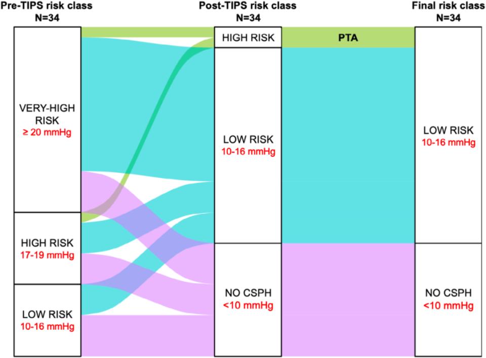 在纳入的患者中,分别有10例、17例和7例患者的TIPS被部分扩张至5 mm、6 mm和7 mm。球囊扩张的平均直径为6.5±0.7 mm。PCPG由21±4.5 mmHg显著下降至11±3.2 mmHg(P<0.001),平均降幅为51%±13%(其中,21例患者(62%)PCPG下降≥50%,32例患者(94%)PCPG下降≥30%)。最终支架直径为5/6/7 mm的患者分别为9/17/8例,且所有患者最终均达到PCPG<16 mmHg。在TIPS置入前,8例患者(24%)PCPG为14-16 mmHg(低风险组),7例(20%)为17-19 mmHg(高风险组),19例(56%)≥20 mmHg(极高风险组);TIPS置入后:11例患者不再存在CSPH(平均PCPG 7±2.2 mmHg),21例进入低风险组(平均PCPG 12±1.7 mmHg),2例仍处于高风险组(PCPG均为17 mmHg),无患者仍处于极高风险组(表2和图2)。