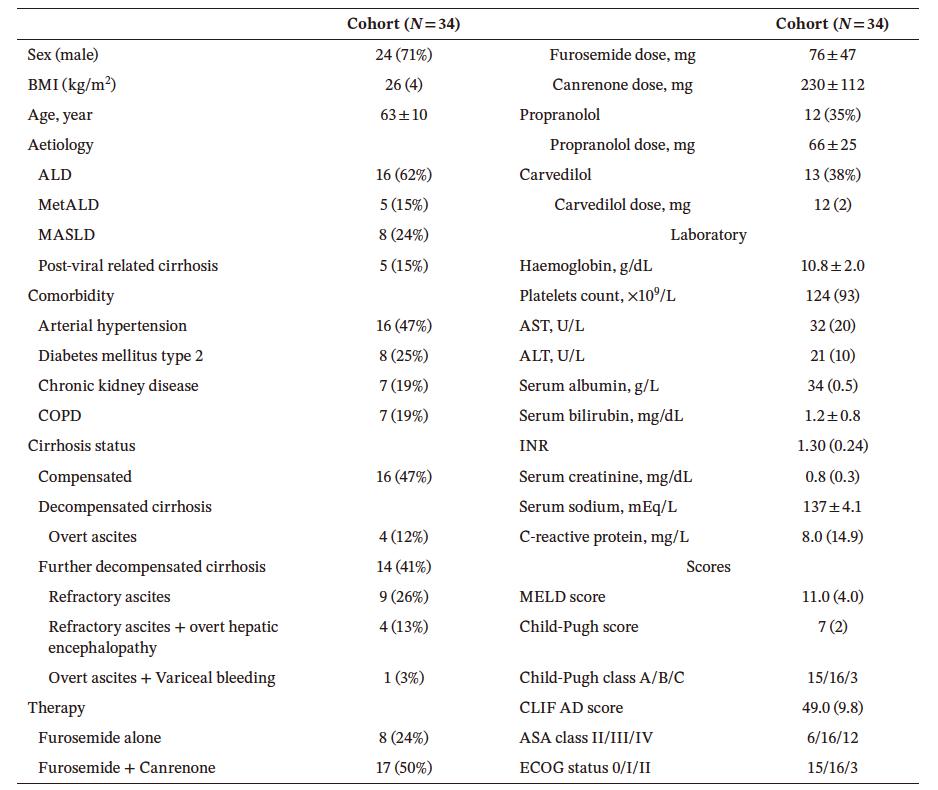 排除标准包括:TIPS指征与外科手术指征相互独立、因肝细胞癌(HCC)治疗而行肝脏手术、存在TIPS禁忌证(包括重度肝功能衰竭[Child-Pugh评分>11、血清胆红素>3 mg/dL、MELD评分>18]、严重器质性肾功能衰竭、既往心力衰竭病史、左心室射血分数<50%、中重度主动脉瓣狭窄),以及在充分治疗后仍反复或持续存在的显性肝性脑病。研究筛选284例患者,最终纳入34例(12%)(图1)。
