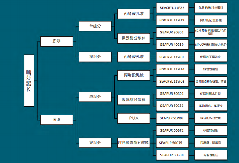 ●粉料包覆型底漆:SEACRYL 11P22、SEAPUR 30G01(单组分丙烯酸乳液/聚氨酯分散体),具备优异的粉料包覆性与柔韧性,成膜均匀,能有效填充木材导管,为面漆打下平整基础;