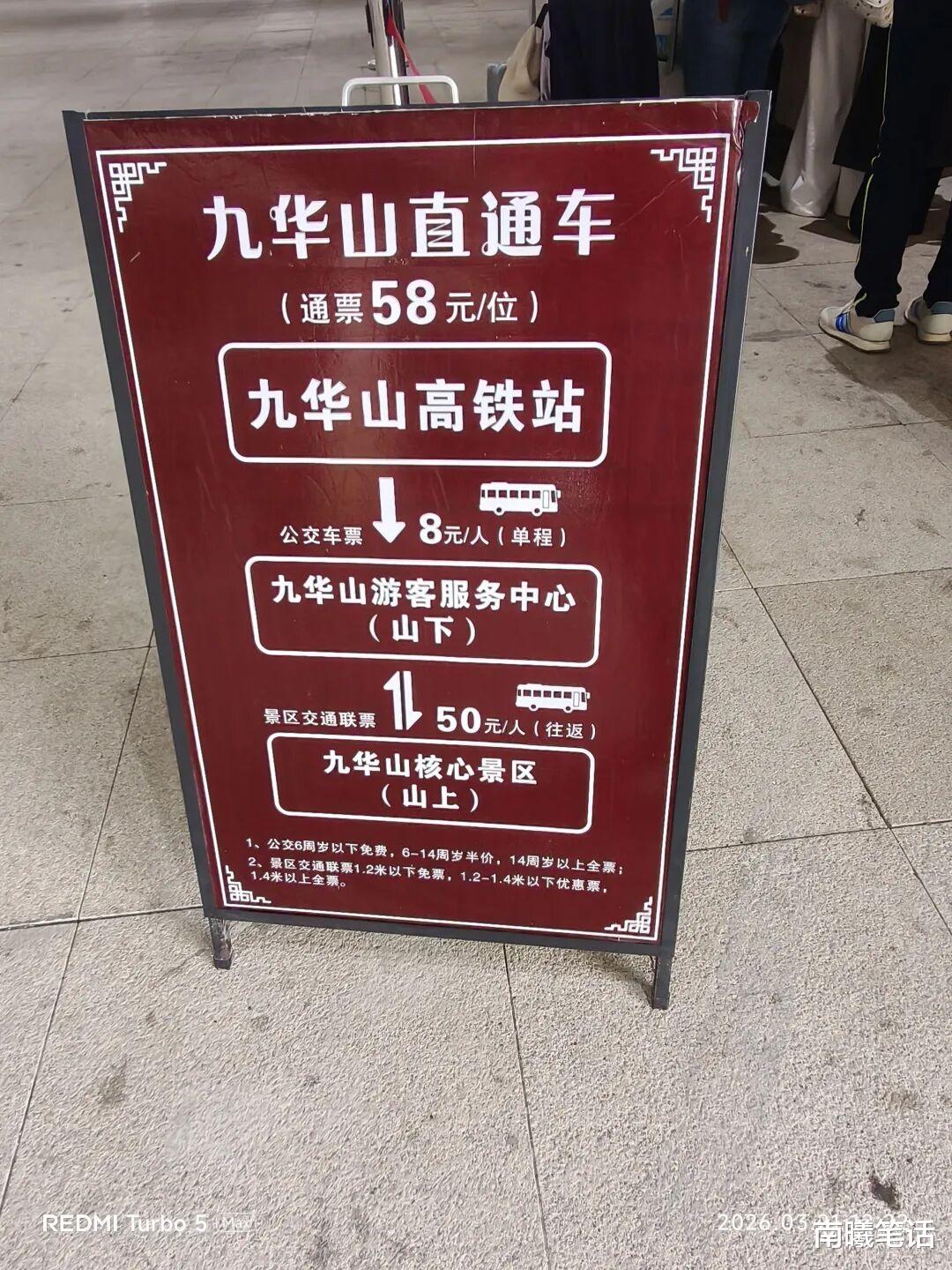 - 高铁党:九华山站下车,出站后即有直达九华山柯村游客中心的景区大巴,车程约1小时,票价8元。【池州站下 也有】,ps:通票 50,所以 58 元含(高铁站到游客中心,游客中心或大愿文化园到九华街(双向),九华街虎形山站到天台景区索道处凤凰松站,游客中心到天台站)