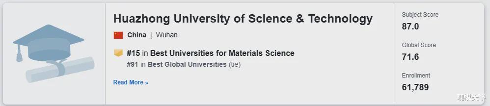 华中科技大学这次冲到了全球第15名,大陆第8,要知道华科材料在第四轮学科评估里只拿了B+,跟清华北航那些A+没法比,但人家这几年进步是真快,院士领衔,40多位国家级人才,还有材料成形与模具技术全国重点实验室撑着,10多位教授入选全球高被引学者,ESI材料学科也冲进了全球前万分之一,说白了,论文产出和学术影响力上来了,在U.S.News这种重论文的排名里自然就水涨船高,现在华科材料紧追上海交大,这个势头确实猛,