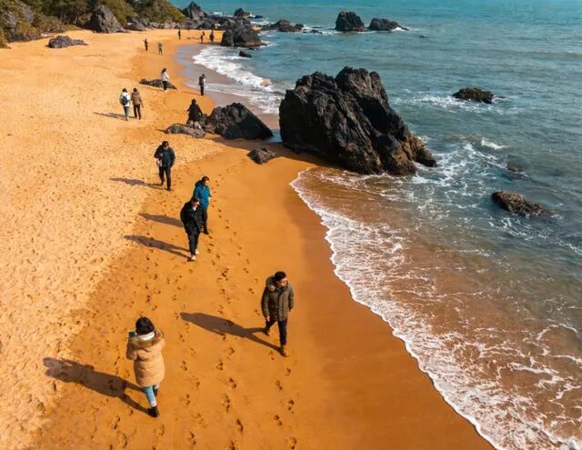 还有那块“南天一柱”巨石,像俄罗斯的巨型滑翔炸弹,威武雄壮地立在海边,任凭风吹浪打,直指苍天。日月石被暖阳镀成金黄,甜蜜地依隈在碧海清波中。这一大片海湾上的石头,就是一场永不落幕的自然雕塑艺术展。