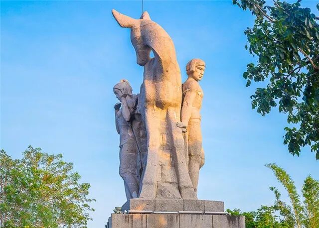 山不在高,只缘有爱。一组汉白玉雕塑屹立在山头,那是一位英俊勇武的黎族青年猎人,追杀一头母鹿,从五指山一直追到这天涯海边。身处绝境的母鹿没有哀嚎,只是凄然回头,用清澈温柔的明眸,静静地看着猎人。猎人狂暴的心,触碰到似水的眼泪,他情不自禁地放下了弓箭。母鹿化着美丽的少女,与他在此相亲相爱,男耕女织,繁衍生息。