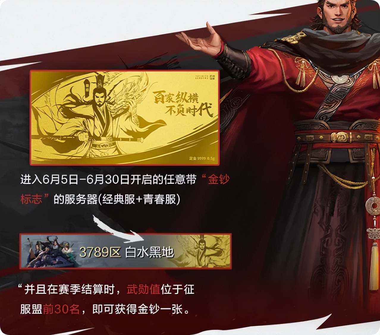 所有参与夺金钞的玩家,只要所在同盟能在评定时取得赛季征服,并且自己的武勋排名位于同盟的前30,就能获得一张重0.5G的由纯金打造的率土纪念金钞!