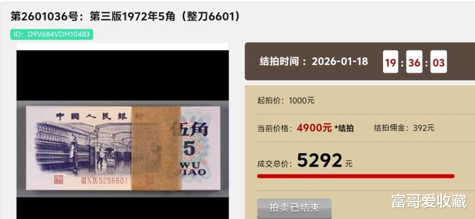 在2026年1月18日的“钱币拍卖会”中,就有“整刀”(一百张连号)的“纺织五角”,最后拍出了5292元。而单张价值在52元左右。