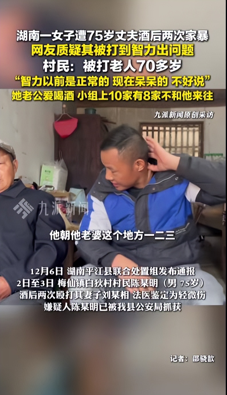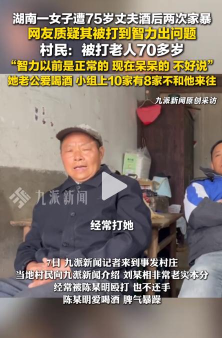 湖南一女子被75岁丈夫酒后两次家暴,村民:女子被打从不还手,男子动手不是一次两次.九派新闻.2025-12-08
