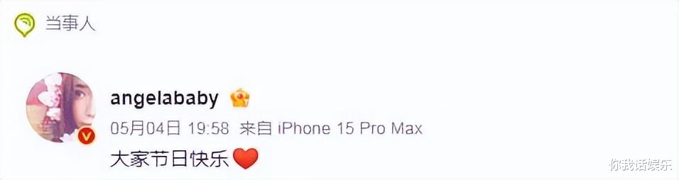 Angelababy在五月四日这一天,她在社交平台发文:“大家节日快乐。”