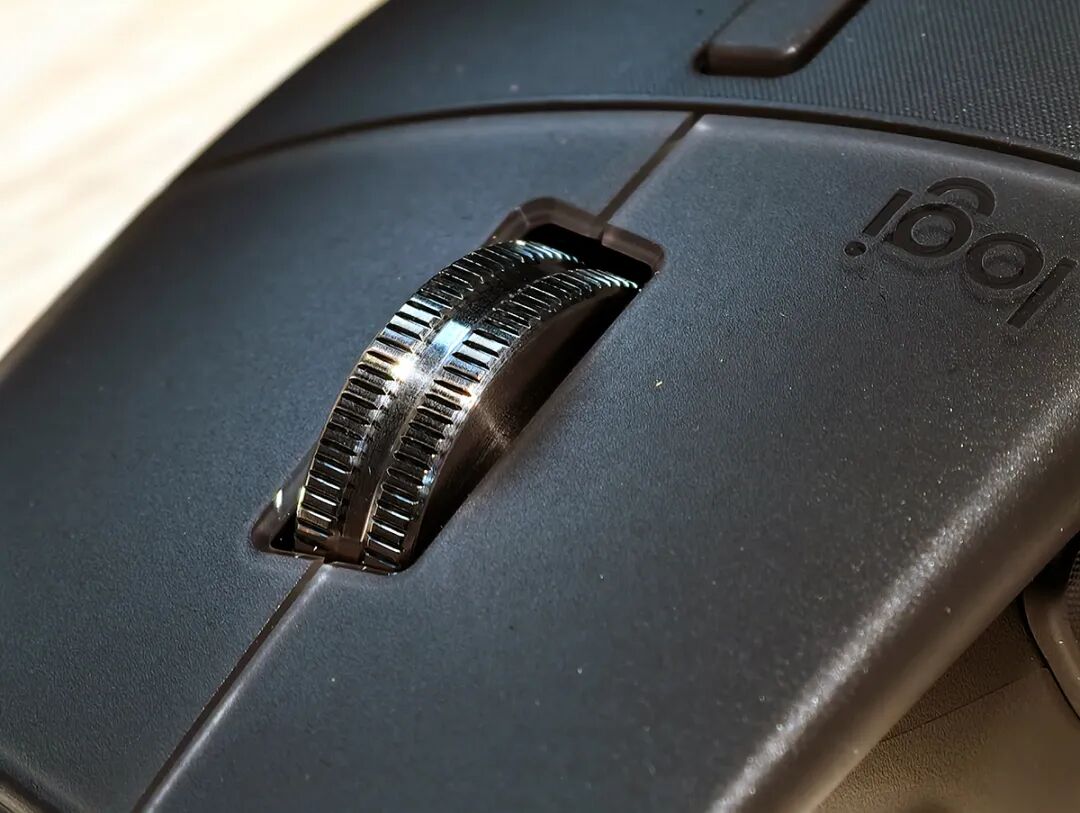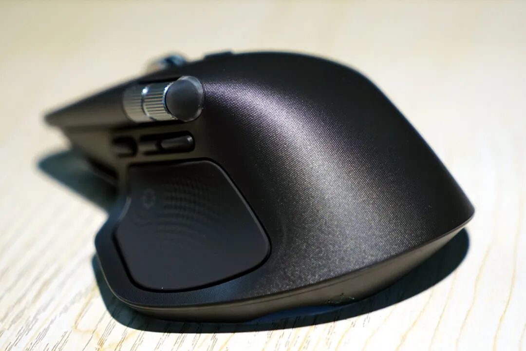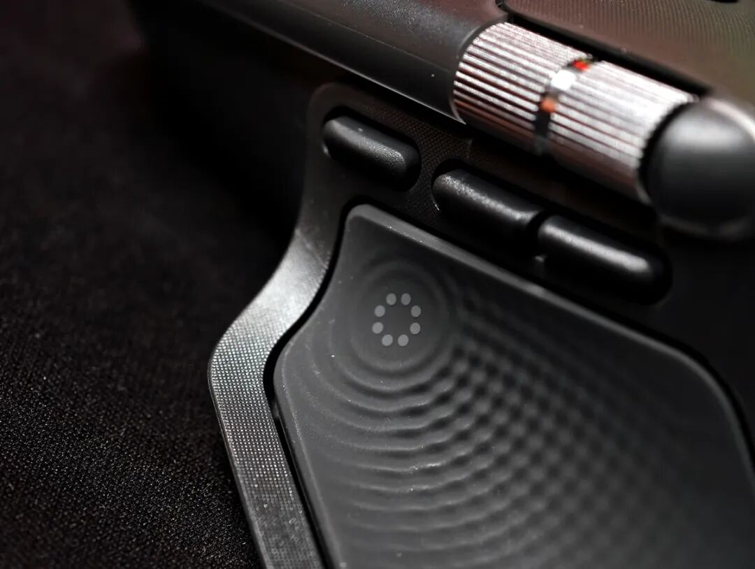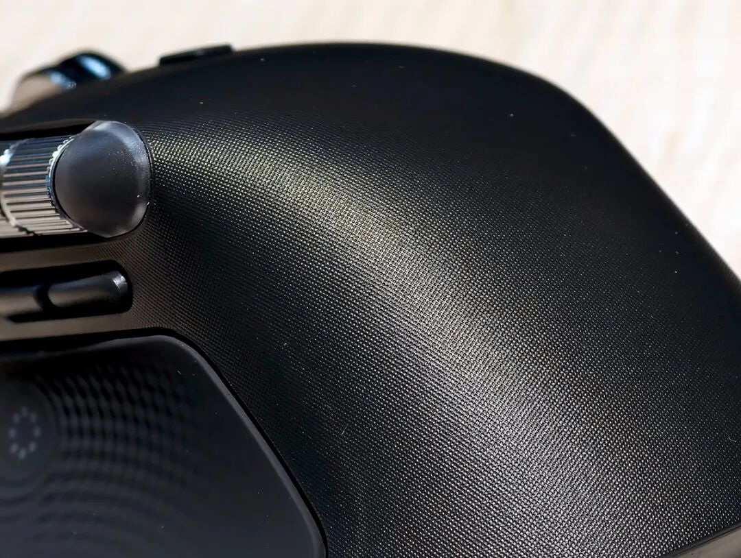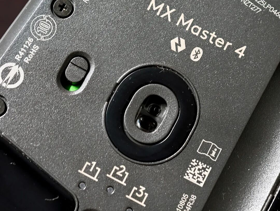 过去几代MX Master系列采用的都是类肤材质,这个材质非常贴合手掌并提供一定的掌控力,当然缺点也同样明显,我这种手汗比较旺盛的人,在长时间的使用中会留下痕迹——我的MX 2s和MX 3几乎已经伤痕累累,这次MX Master 4改用微孔透气设计,这个设计的目的应该是为了考虑使用的耐久度,通过表面细小的凹槽来为手掌提供细微的空气流动,虽然不能完全解决我“硫酸手”的问题,但长时间使用后手心确实清爽了不少,但是如果你是干性皮肤的话面对这个全新的设计会略有些“松动感”。